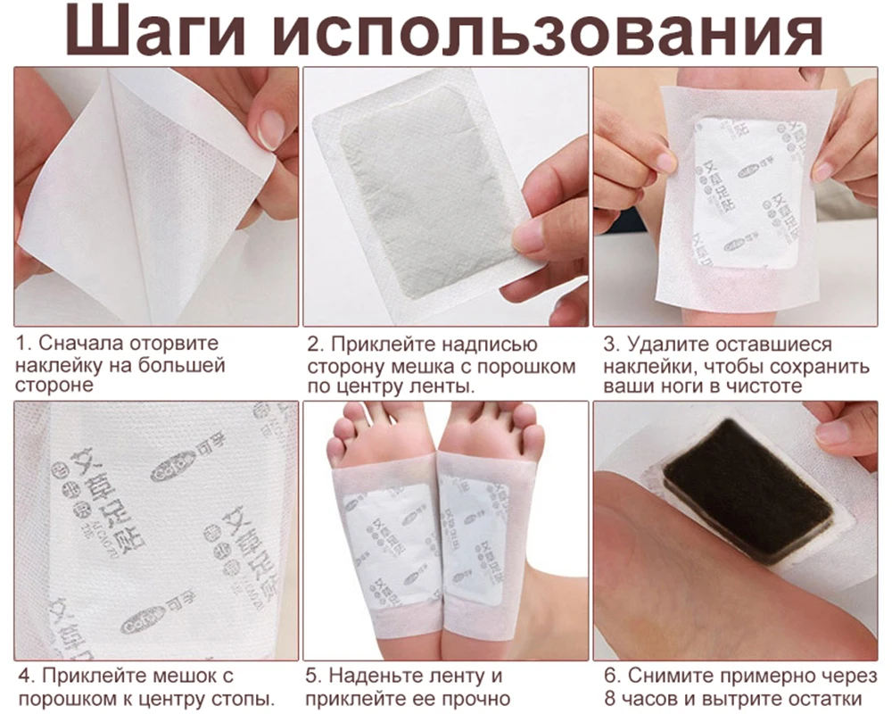【Шаги использования】 1.Сначала оторвите наклейку с большей стороны 2.Приклейте слова стороне порошка мешок на центр ленты 3.Удалите оставшиеся наклейки, чтобы ваши ноги были чистыми 4.Приклейте пакет с порошком к центру стопы 5.Разгладьте вокруг ленты и плотно приклейте ее к стопе. 6.Отклеить примерно через 8 часов и вытереть остатки
