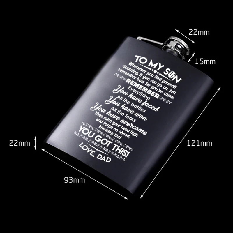 Вы ищете уникальный подарок для вашей любви? Ваши поиски закончены! Гравюрный Флагон идеален! Подарок, который он будет ценить на всю жизнь! Это Флагон с значимым сообщением, напечатанным на поверхности флагона, который помогает ему длиться навсегда. 1 унция = 28,35 г = 16 драм = 29,5 мл Особенности: Материал: нержавеющая сталь 304 Ёмкость: 8oz Вес: один 130 г (набор 320 г) Посылка включает в себя: 1x плоская фляжка