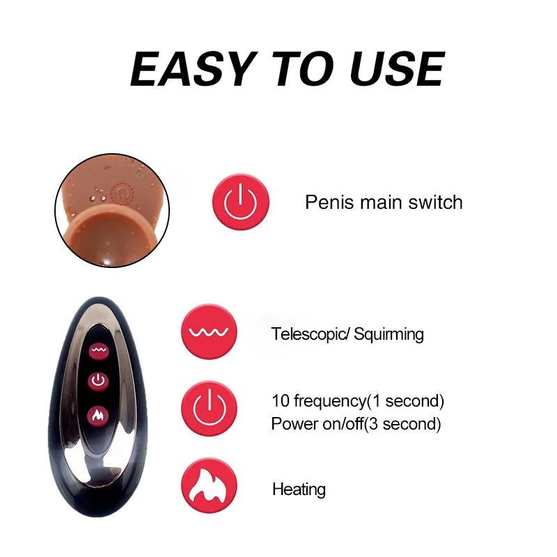 Функция: 1. 7-частотная вибрация 2. 3 см Телескопический и вращающийся (Напоминание: Телескопический и вращающийся работают одновременно) 3. Электрический нагрев 4 водонепроницаемый 5 хватает на один час, заряжайте 50-60 минут. (Зависит от конкретных условий использования) 6 беспроводной пульт дистанционного управления 3 м