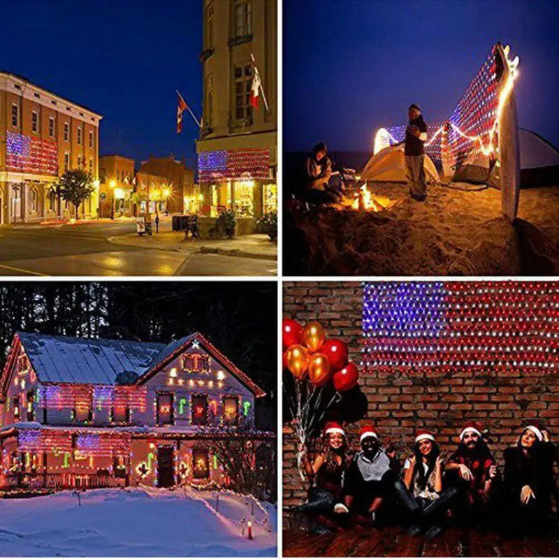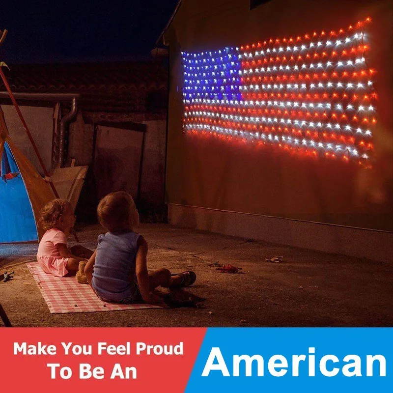 specification: Product Name: American Flag Net Light Product Specification Length: 2 meters wide and 1 meter high Color: Red, blue and white lamp beads Quantity: 390 lamps Wire: 1.6-diameter all-copper PVC transparent wire Plug: American standard white acute plug with fuse Voltage: 110V Mode: always on Packing: Neutral cowhide box packaging Inner box size: 17*9*10cm Feature 【Cool American Flag Light Effect for All Day Decoration】Display your patriotic spirit with this unique LED flag net lights. Great for Memorial Day, Independence day, 4th of july decorations, Christmas, festival , holiday , party, ceremony, and many other celebration occasions. This American Flag decor designed can be portable,suspended, laid, flexible to use, put on tree, vine, porch roof, bedroom window, balcony, wall, bringing warm and pleasant atmosphere to your home or party. 【Perfect Style & Size】This USA flag lights with 390 super bright LEDs and three colors which is blue, white and red, 6.5ft*3.28ft/2m *1m High brightness LED is Cost effective, energy efficient and environmental protection and long lifetime.Clear plastic frame construction allows lights to be seen from both sides. 【Safe to Use & Easy to Install】Decoration and cord are UL approved to ensure & maximize the safety. It's very safe during use; Easy installation with simple plug, directly plug in and unplug it for power on and off. 【Integrated Design & Better Waterproof】Waterproof rank is IP44.No longer have to worry about the rainy day. perfect for both indoor and outdoor decorations. such as yard, garages, porch, patio, fence, lawn and garden etc. package including: 1*net light