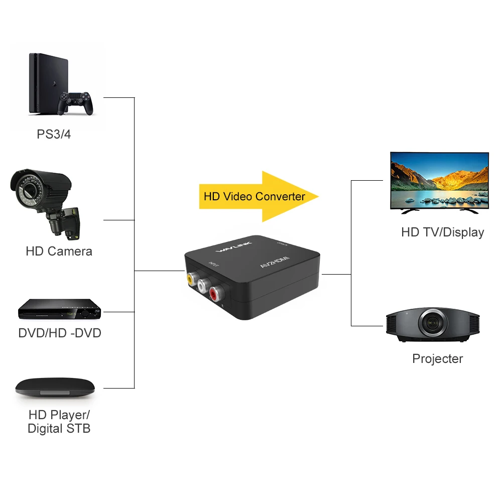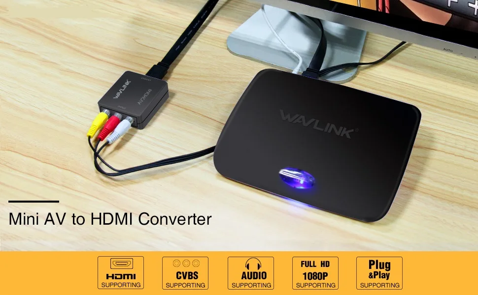 RCA в HDMI конвертер, Wavlink 1080p 3RCA в HDMI CVBS AV композитный видео аудио адаптер с USB зарядным кабелем поддержка 1080P для ПК ноутбука тв STB VHS VCR камеры DVD