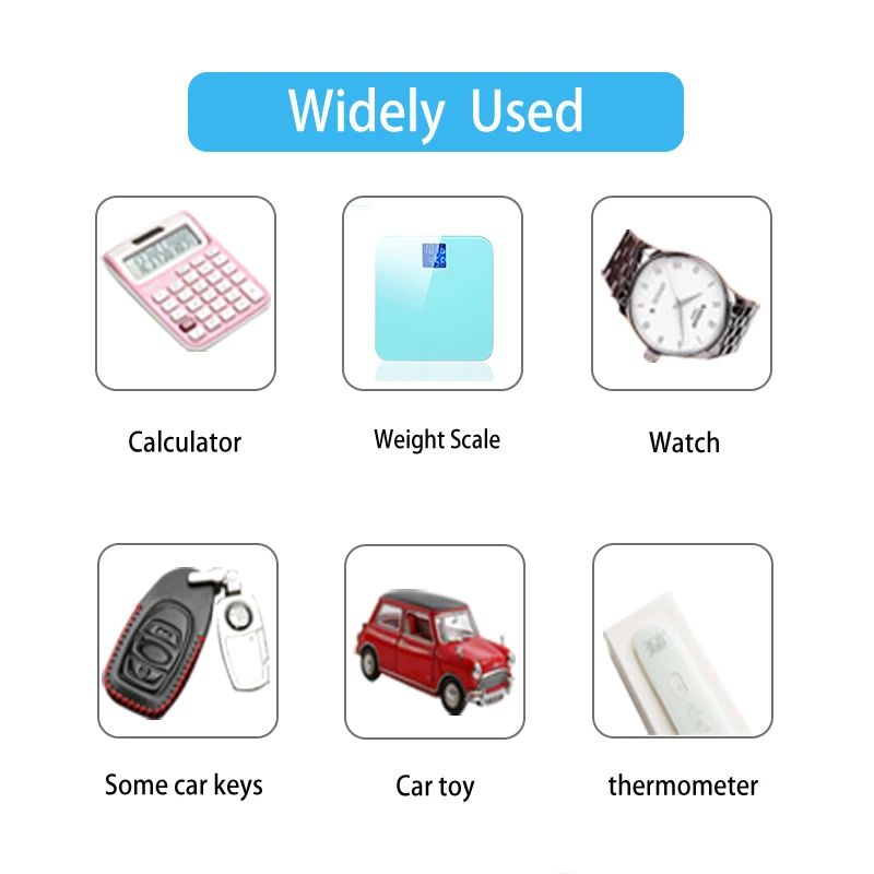 Используется для электрической игрушки, калькулятора, материнской платы компьютера, часов, камеры, автомобильной охранной сигнализации, автомобильных пультов без ключа, электронного слухового аппарата, КПК, электронных органайзеров, Ошейников для домашних животных, счетчика, дистанционного управления, электронного инструмента, измеритель уровня глюкозы в крови, измеритель уровня холестерина, светодиодный светильник и другие электронные приборы.