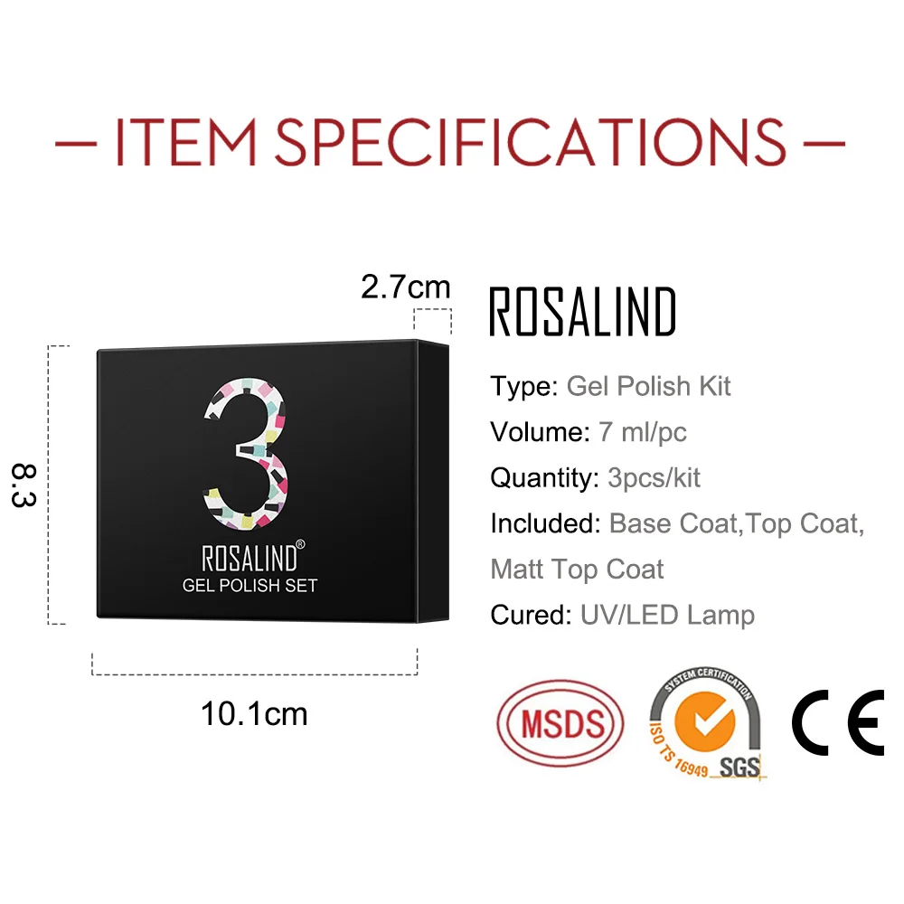 Качество-наш первый приоритет. Гели остаются блестящими до 30 дней. Самые популярные цвета на выбор. Подходит для всех случаев. Характеристики Товара: Розалинд Название: набор манникуров для дизайна ногтей Количество: 9 предметов Используется для: маникюрный и маникюрный инструмент Три шага для маникюра самостоятельно: 1.-форма поверхности ногтей, очистить кутикулы, для полировки ногтей поверхности и очистить пыль. 2.-Нанесите базовый слой ROSALIND (не забудьте запечатать край ногтя). Вылечите светодиодный светильник в течение 60 секунд или УФ-лампа в течение 2 минут. 3.-нанесите 2-3 слоя цветного пальто ROSALIND. Вылечите светодиодный светильник в течение 60 секунд или УФ-лампа в течение 2 минут. 4. Нанесите больше слоя цветного пальто, если цвет недостаточно яркий. 5.-нанесите верхнее пальто ROSALIND. Вылечите светодиодный светильник в течение 60 секунд или УФ-лампа в течение 2 минут. 6.-протрите липкий остаток на ногтях очищающим средством. Два шага для удаления: 1.-Замочите ногти в акриловое средство для удаления около 5 минут. 2.-аккуратно разорвите весь кусок эмали для ногтей на каждый ноготь.