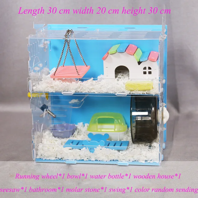 Это Клетка для хомяков, акриловая клетка для морской свинки, двухслойная большая вилла, маленькие товары для домашних животных, полная посылка игрушек Цвет: розовый, синий Размеры: 30x19x30cm Материал: акриловое волокно Примечание: Вы должны завершить сборку самостоятельно Упаковка: клетка + все аксессуары