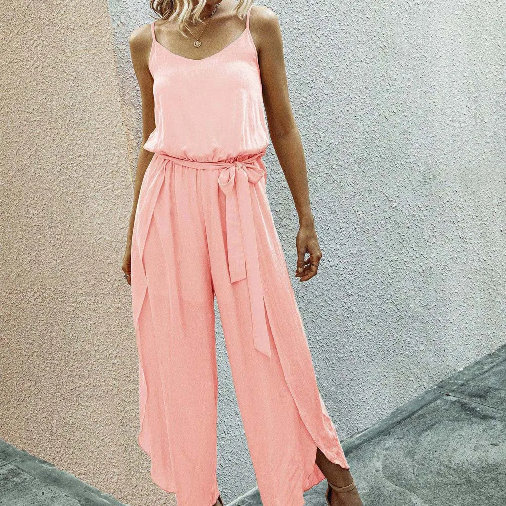 Без рукавов, Цветочный Принт, пояс, высокая талия, талия на шнурке, эластичная манжета, один предмет Комбинезон; Повседневный брючный костюм; Свободная одежда для сна; Повседневная одежда для отдыха