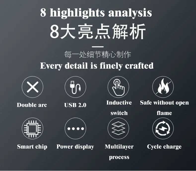 Двойная дуга, молниеносное зажигание, обновление ядра, сенсорное распознавание Удобная зарядка через USB, напоминание об аккумуляторе Сенсорное распознавание, чувствительное распознавание Четкий стальной звук, чистый и приятный Технология PVD ice surface делает цвет более красивым и выдающимся