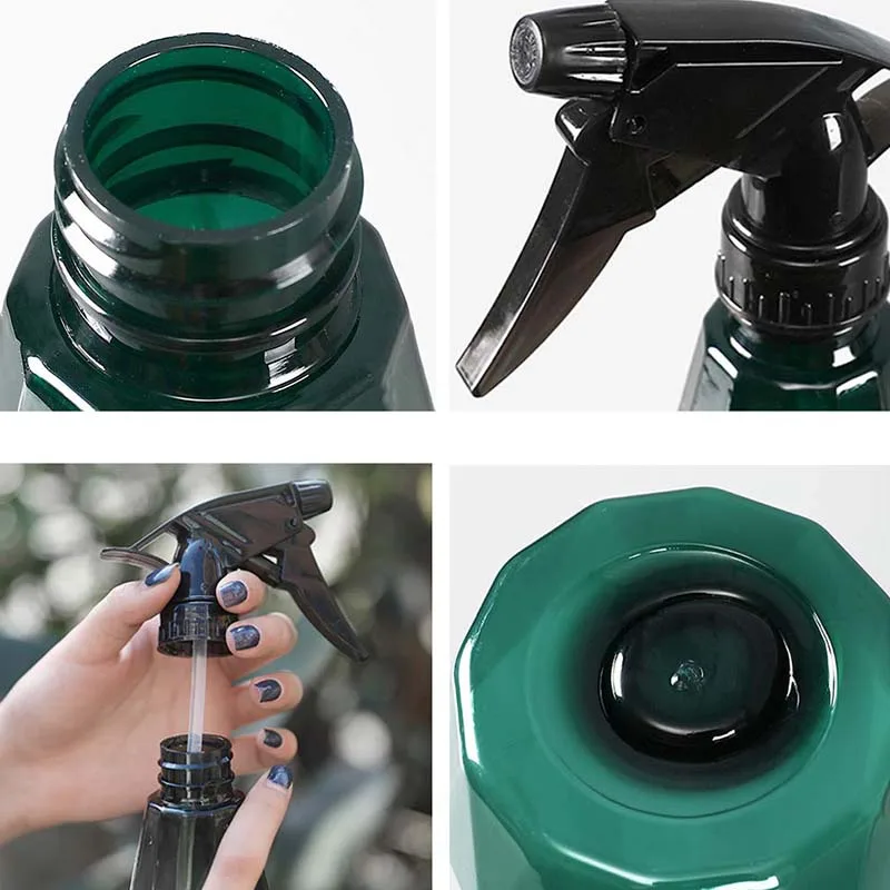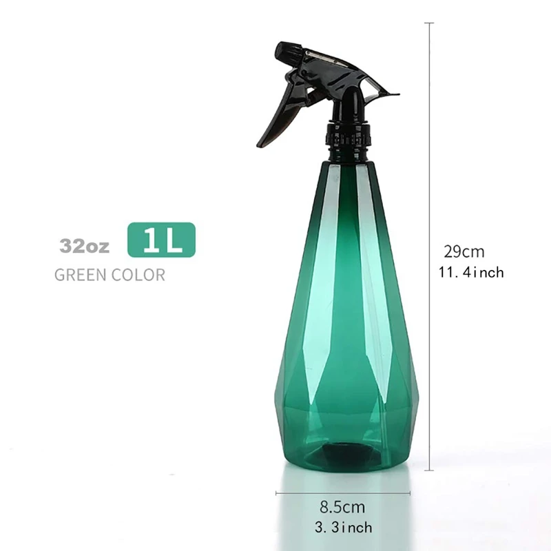 Гуманизированный дизайн: прозрачная бутылка помогает вам четко знать оставшуюся емкость жидкости. Благодаря уникальному наклону бутылка удобно помещается в руке, а пальцы легко ложатся на спусковой крючок. Алмазная поверхность, непревзойденный внешний вид, который является гладким и красивым, наша современная бутылка-спрей идеально украсит ваш дом и сад.