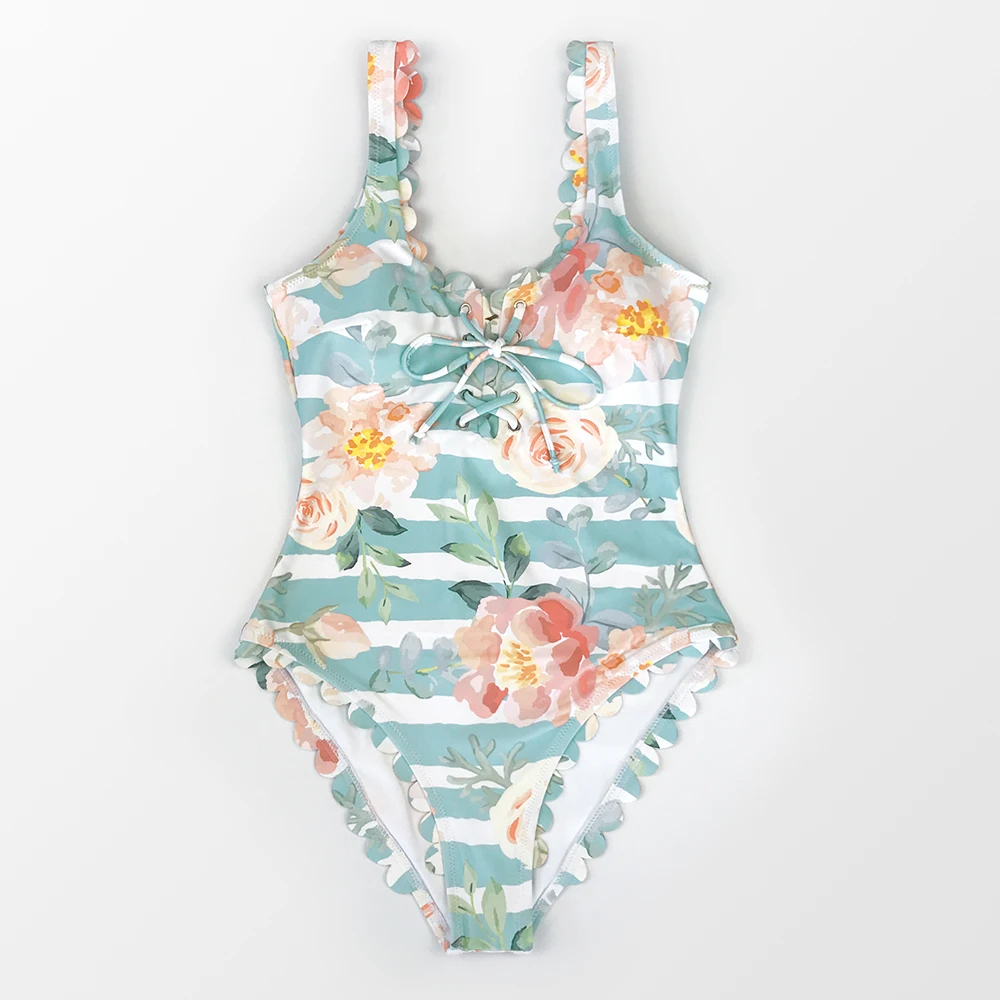 Этот милый купальный костюм с цветочным принтом, который мы любим. Наш цельный купальник в цветочек и полоску с волнистыми краями, со шнуровкой спереди и съемными мягкими чашечками, поддерживающими светильник.