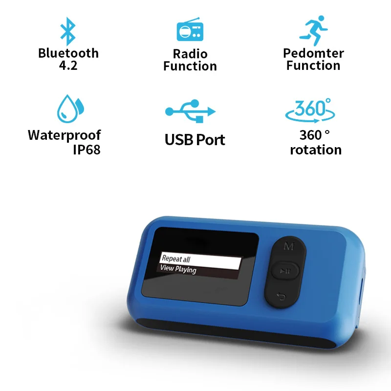 1. Водонепроницаемость: Водонепроницаемость IP68: выдерживает погружение до 10 дюймов/3 метра2. С экраном: 0,91 дюйма экран: легко Переключить режим воспроизведения;3. Память: флэш: 16 Гб (микрон)4. Bluetooth: Bluetooth 4,25. С USB-портом: может легко передавать данные с компьютера файловый менеджер, создавать плейлист6. С разъемом для наушников 3,5 мм7. Небольшой размер и портативный Размер товара: 6,4*3,25*1,55 см/2,5*1,3*0,6 дюйма, легкий: 29,5 г/1,05 унции8. С зажимом, может поворачиваться на 360 градусов: 360 градусов вращающийся настольный зажим9. С Радио: FM-радио10. С шагомером: шагомер11. Режим воспроизведенияЗаказывала толстовку для сына. Если честно качество прям удивило, думала придет хуже. Товаром довольна, толстовка теплая стильная, сыну понравилась. С... Читать отзыв полностью...