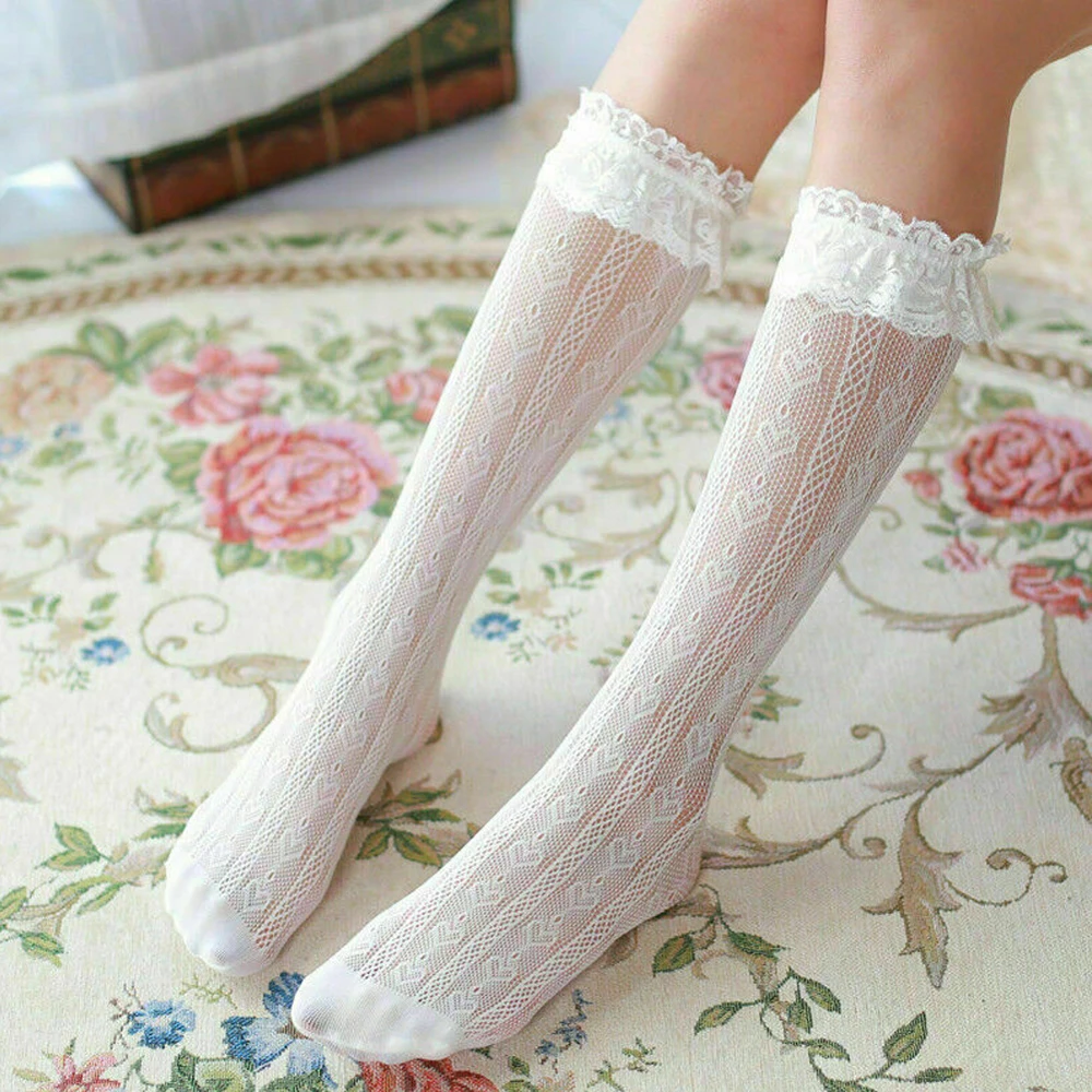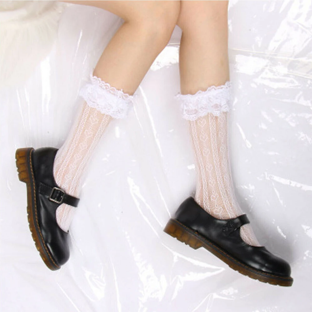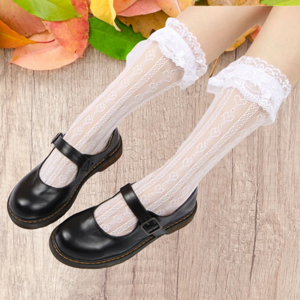Милые кружевные носки до середины голени в стиле Лолиты с цветочным принтом для девочек мягкие эластичные короткие носки в сеточку с рюшами новые модные черно-белые носки