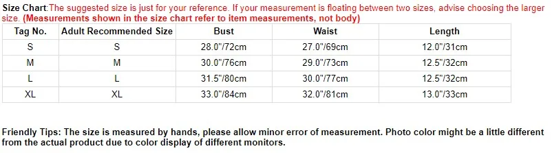 Номер бирки Рекомендуемый размер для взрослых Бюст Талия Длина S S 28,0 "/72 см 27,0 "/69 см 12,0 "/31 см М М 30,0 "/76 см 29,0 "/73 см 12,5 "/32 см L L 31,5 "/80 см 30,0 "/77 см 12,5 "/32 см XL XL 33,0 "/84 см 32,0 "/81 см 13,0 "/33 см