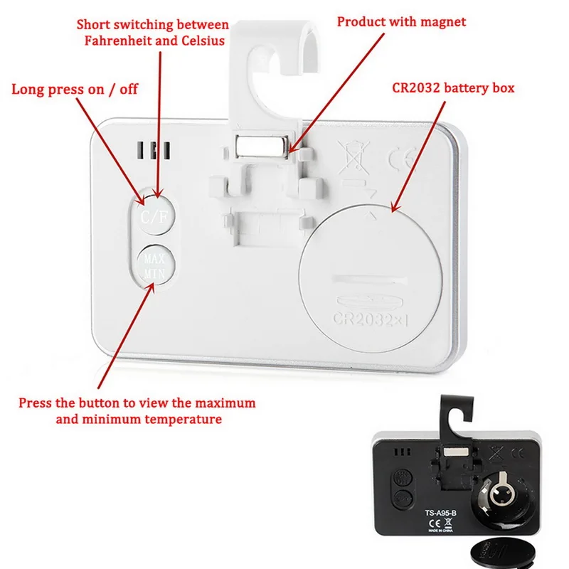 -- Установка: два варианта размещения для комнатного Термометра. Либо Прикрепите его к двери холодильника с помощью магнита на задней стороне, либо используйте крючок, чтобы повесить его.