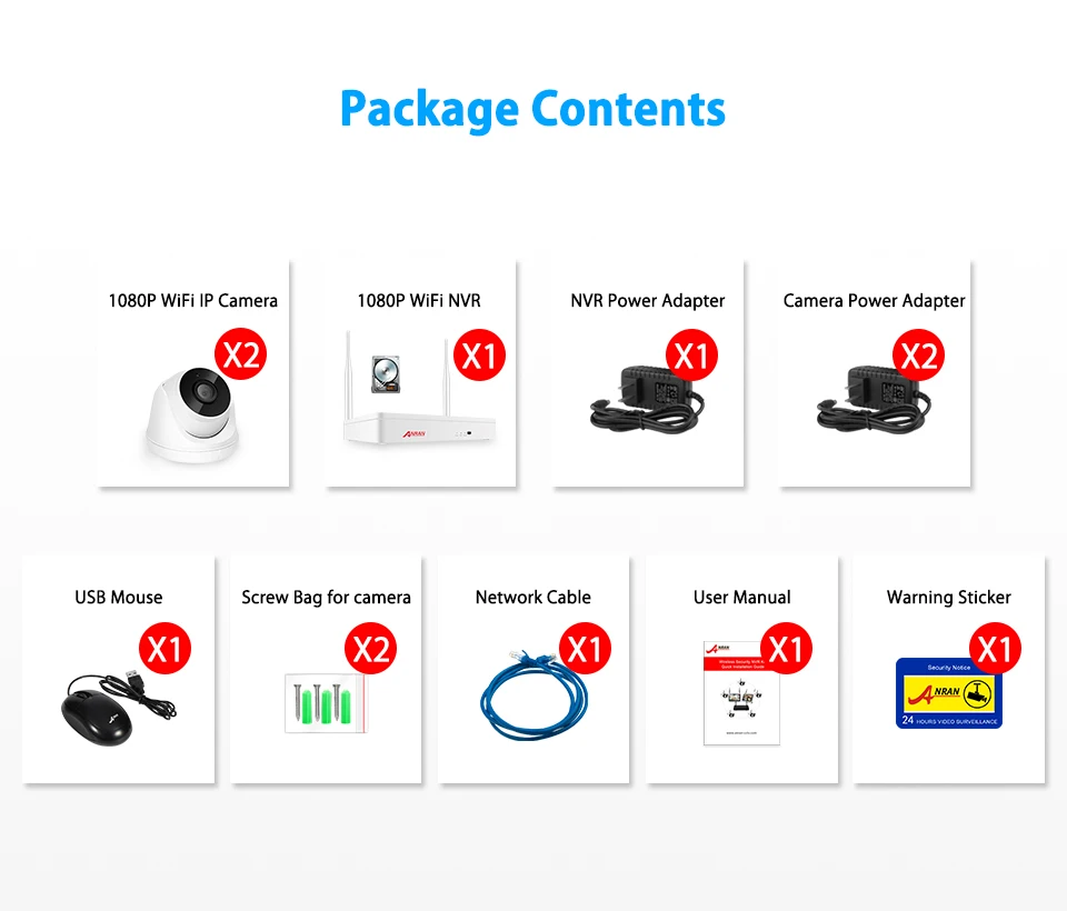 · 1x 4CH Беспроводной NVR · 2x Крытый камеры · 2х источник питания для камеры · 1x источник питания для NVR · 1x USB мышь (подарок) · Предупреждение ющая наклейка (подарок) · 2x Упаковка винтов · 1x 3 фута 1 м Ethernet кабель (подарок) • 1x Руководство по быстрой без жесткого диска