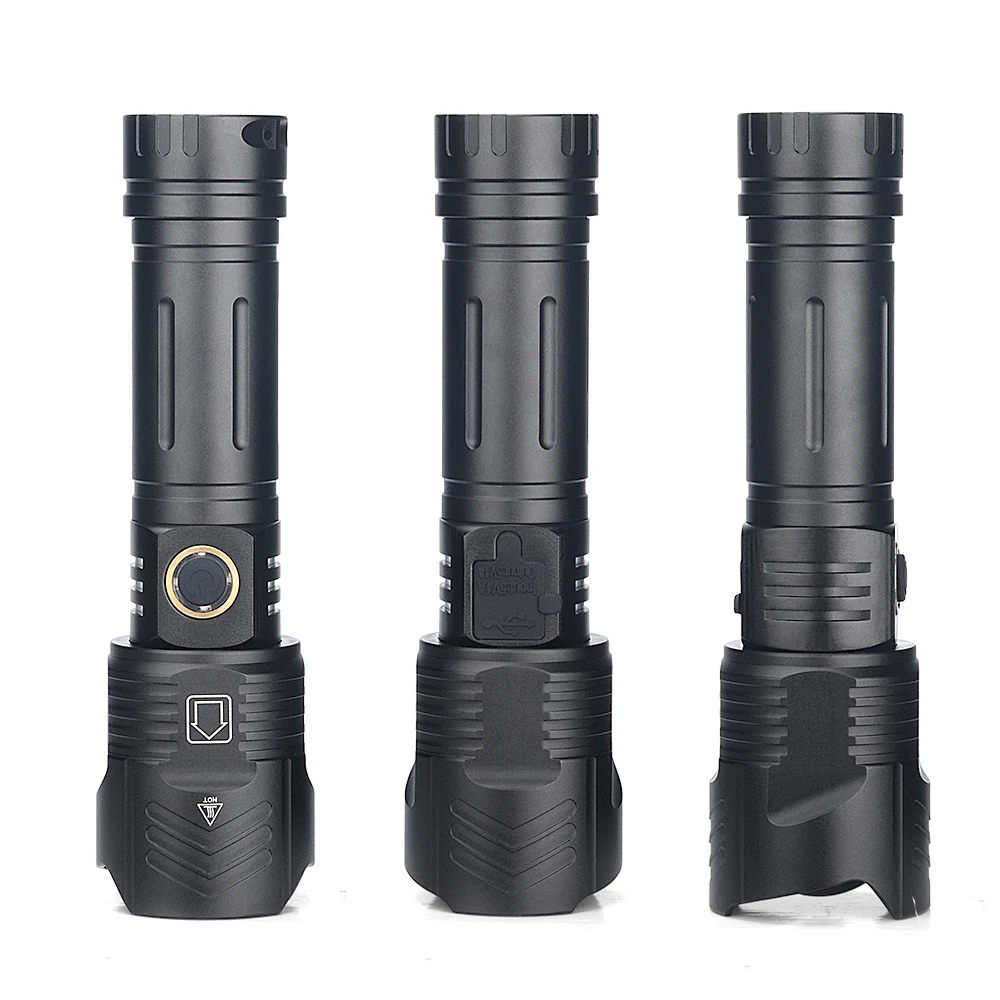 Светильник источник: XHP90.2 Внешний вид цвет: черный Размеры: 17,0 см × 4,8 см × 3,3 см Источник питания: 1 аккумулятор 26650 или 1 аккумулятор 18650 Метод зарядки: Прямая зарядка через USB Диапазон: от 200 до 500 метров Водонепроницаемый Рейтинг: IPX-6 Вес нетто: 200 г (без аккумулятора) Материал корпуса: алюминиевый сплав Масштабирование: регулируемый фокус Материал: Алюминий из алюминиевого сплава 3 режима переключения: Сильный-слабый-стробоскоп