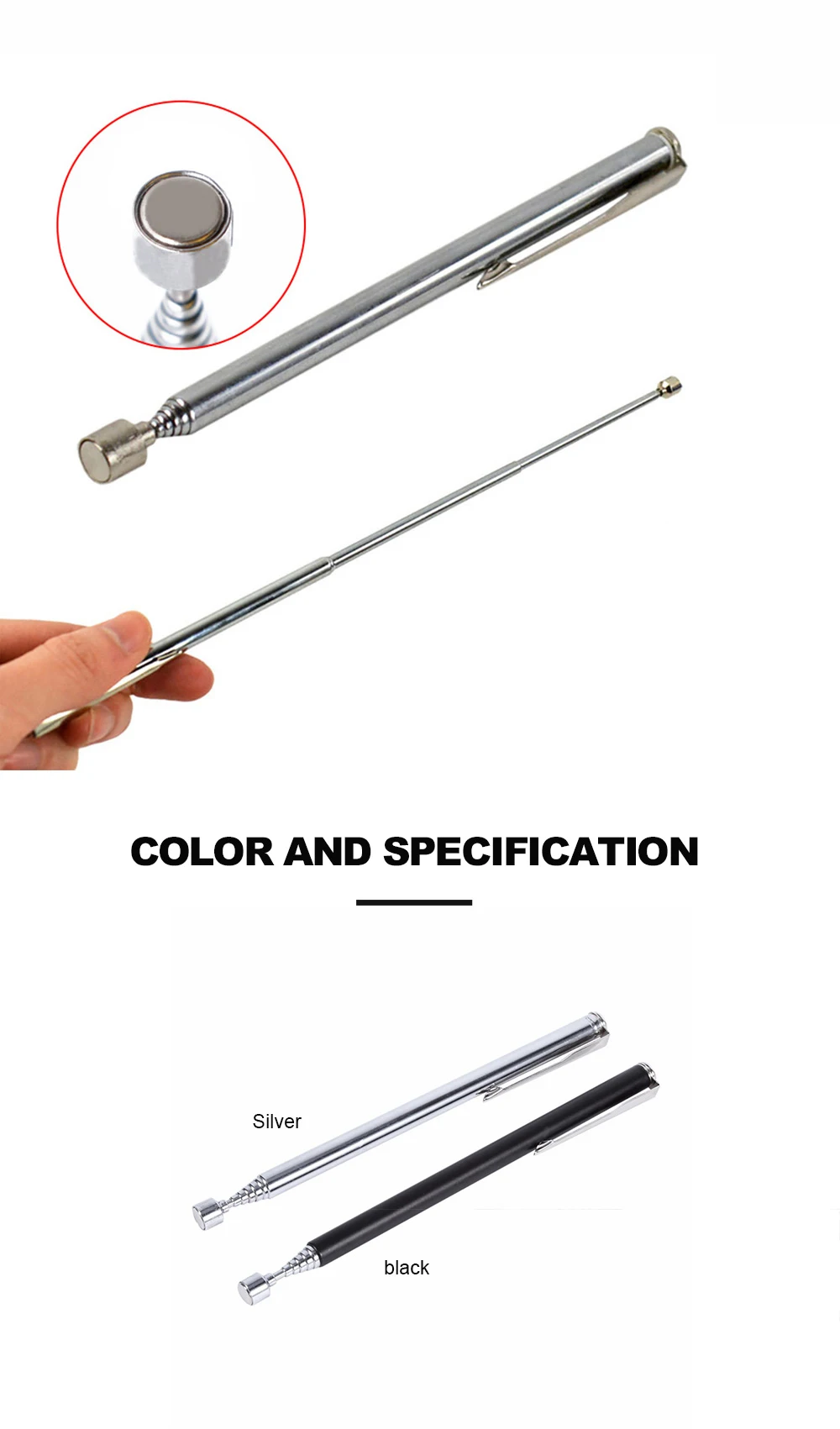 = Item Description = Material: metal + magnetic Color: Silver / Black (optional) Length: about 140 ~ 650mm / 5.512 ~ 25.59 inches (adjustable) = NOTICES = 1.Pen pocket clip, easy to carry and use. Retractable design, the head can absorb into the narrow space. 2.Suitable for all kinds of automobile factories, high pollution, textile workshop, narrow space, can pick up nuts, bolts, screws and other metal parts. 3.The calibration of the monitor is different. The color of the items shown in the photo may be slightly different from that of the real object. Please take the original as the standard 4.Due to manual measurement, please allow 1-5mm error. Thanks for your understanding. 5.Please keep it out of the reach of children, so as to avoid unnecessary injury to children. 6. If you have any questions, please keep good communication with us.We warmly like to give you satisfy solution. If you love our item, warmly expected your five stars feedback. We will work harder to give you a satisfy service. 7. Your feedback is very important for us, we sincerely invite you to leave positive feedback for us, thank you very much! 8.Website for tracking and querying transportation doc No.: //www.17track.net