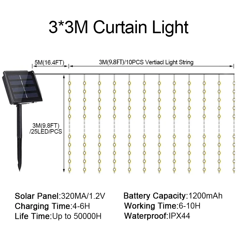 Количество светодиодов каждой нити: 20 шт. (6,5x9,8 футов)/25 шт. (9,8x9,8 футов)