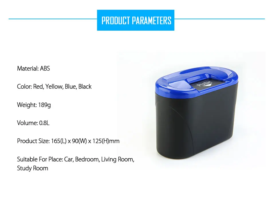 • Материал: АБС-пластик • Цвет: красный, желтый, синий, черный • Вес: 189 г • Объем: 0,8Л • Размер изделия: 165 (Д) x 90 (Ш) x 125 (В) мм • Подходит для: автомобиля, спальни, гостиной, Кабинета