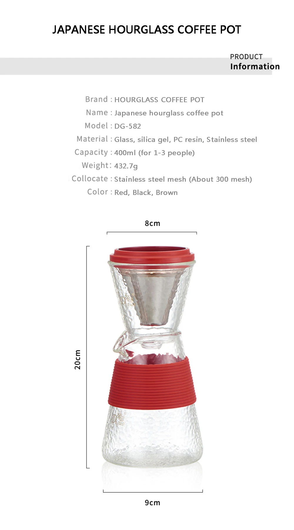 Название: Японский кофейник песочные часы Материал: стекло, силикагель, поликарбонатная смола, нержавеющая сталь Емкость: 400 мл Вес: 432,7 г Размер: 9*9*20 см Цвет: черный, красный, коричневый