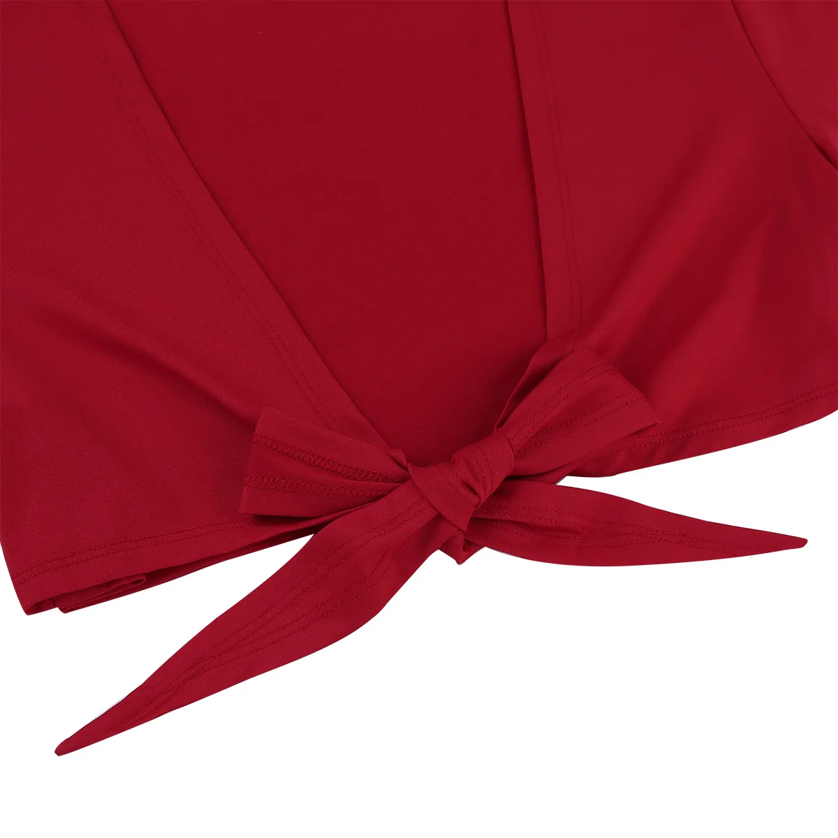 Укороченный топ с глубоким v-образным вырезом и короткими рукавами, завязывается спереди. Пара плиссированной мини-юбки с низкой посадкой.