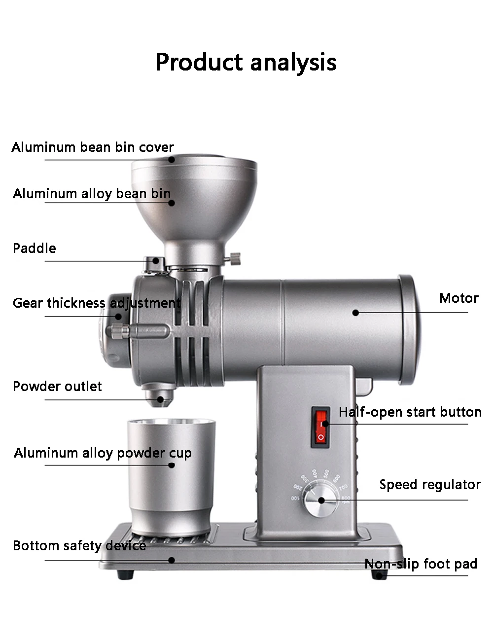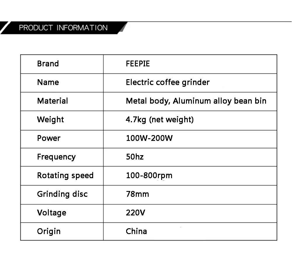 Наименование: Электрический кофемолка Материал: металлический корпус, бобовый ящик из алюминиевого сплава Вес: 4,7 кг Мощность: 100 Вт-200 Вт Напряжение: 220v Размеры: 13*23*31,5 см