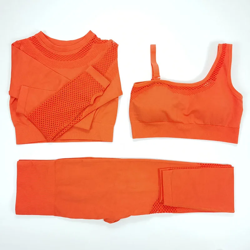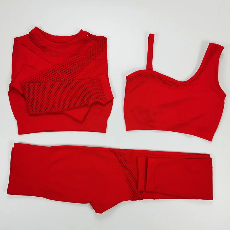 Женский комплект для фитнеса, сексуальный, с длинным рукавом, со съемным плечевым ремнем, спортивный бюстгальтер, бесшовные леггинсы, спортивный комплект для женщин, спортивные костюмы, комплект из 3 предметов для йоги