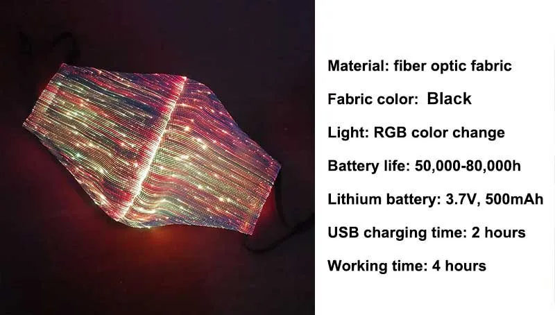 *** 7 красочных огней 5 режимов:-Используйте однокнопочный Переключатель 7 красочных огней, 5 мигающих режимов. Довольно крутой и привлекательный после того, как носил эту светодиодный маску, делая вас звездой на вечеринках. *** Широкое применение:-светодиодный маска идеально подходит для праздников, баров, клубов, электрических светящихся пробежек, светодиодный вечеринок, Хэллоуина, костюмированных вечеринок, Марди Гра, карнавалов, подарков, маскарада и многого другого. Унисекс, отличный подарок как для взрослых, так и для детей. *** Перезаряжаемый и беспроводной:-светодиодный аккумулятор скрыт внутри контроллера. Заряжайте эту маску с помощью usb-кабеля, никаких дополнительных аксессуаров, нет необходимости в аккумуляторах AA. Полная зарядка занимает 1 час, светящаяся маска может непрерывно работать 2-4 часа. Под зарядкой мигает красный светильник. Зарядка, Зеленый светильник мигает или продолжает работать. *** Безопасный и дышащий:-Этот новейший обновленный светодиодный маска изготовлена из высококачественного дышащего волокна и светящейся ткани, мягкая и удобная, без тепла, без излучения, очень безопасная. Сертификат FCC CE RoHS. Параметры: Название: крутая светящаяся маска Материал: Волоконно-оптическая ткань Ткань Цвет: белый Светильник: изменение цвета RGB Батарея жизни: 50000-80000 h Литиевая батарея: 3,7 V, 500 мА · ч. Время зарядки USB: 2 часа Время освещения: 4 часа Применение: дома, фестивалей, гостиниц, банкетов, свадебных мероприятий Используется для верховой езды, бега, танцев, выступлений, вечерние