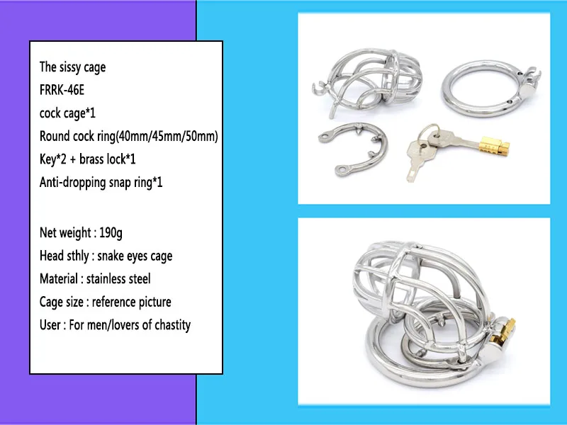 Клетка для Сиши: FRRK46/FAAK46E, с круглым кольцом (40 мм/45 мм/50 мм). Эта клетка с наклонным углом уменьшает выпуклость пениса до скромного шипа, который аккуратно помещается под пару трусиков. Как и в других наших дизайнах, он поставляется с тонкой полировкой в широком диапазоне размеров, готовых выдерживать совершенный износ, клетка Sissy поставляется с использованием высококачественной нержавеющей стали 304. Он поставляется в трех диаметрах, чтобы помочь ему идеально адаптироваться ко всем морфологиям. Мы считаем, что это хорошо подходит даже для искушенных любителей целомудрия!