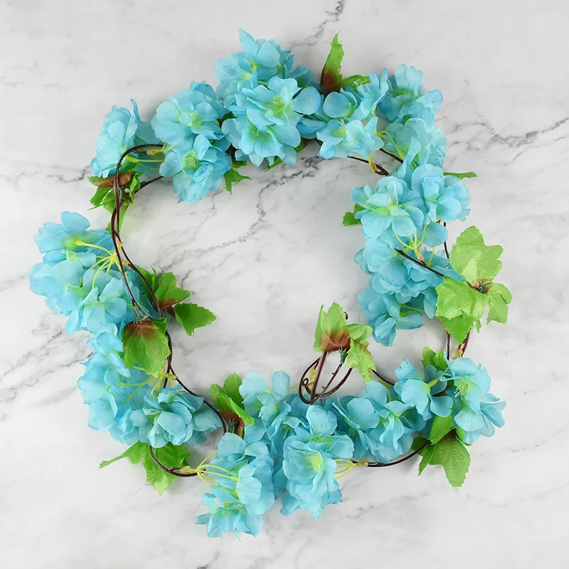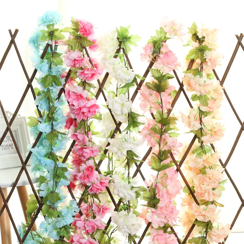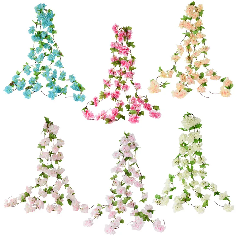225cm Artificial Silk Flower Vine Pretty Pink Cherry Blossom Rattan Green Leaves Vine String Garland for Wedding Home Decoration