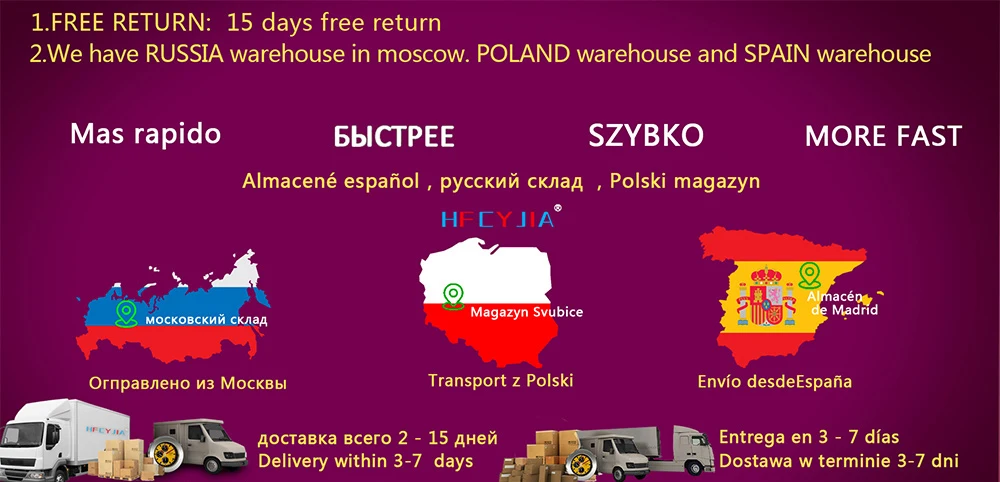 1. Склад ЕС/России/Китая2. 2 года гарантии3. 15 дней бесплатного возврата4. 24-48 часов доставки5. Лучший сервис