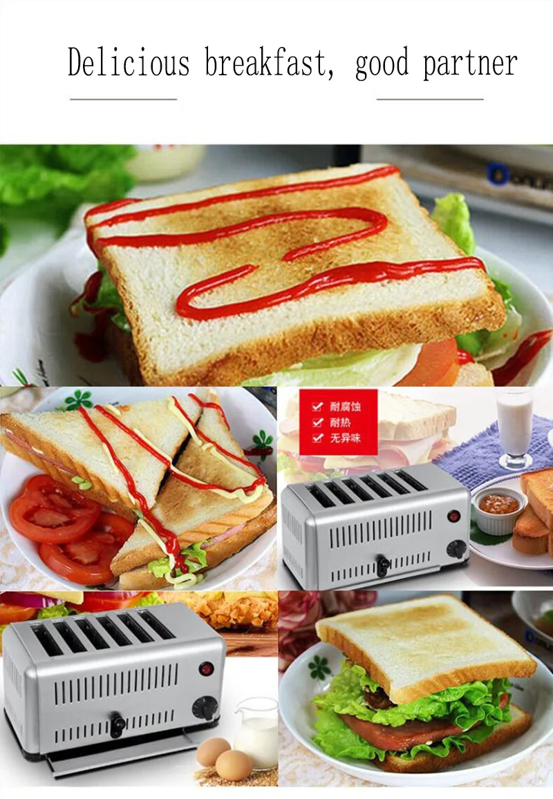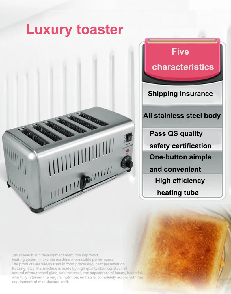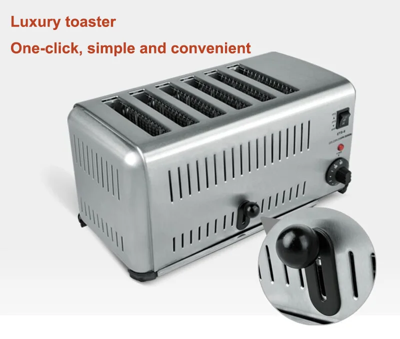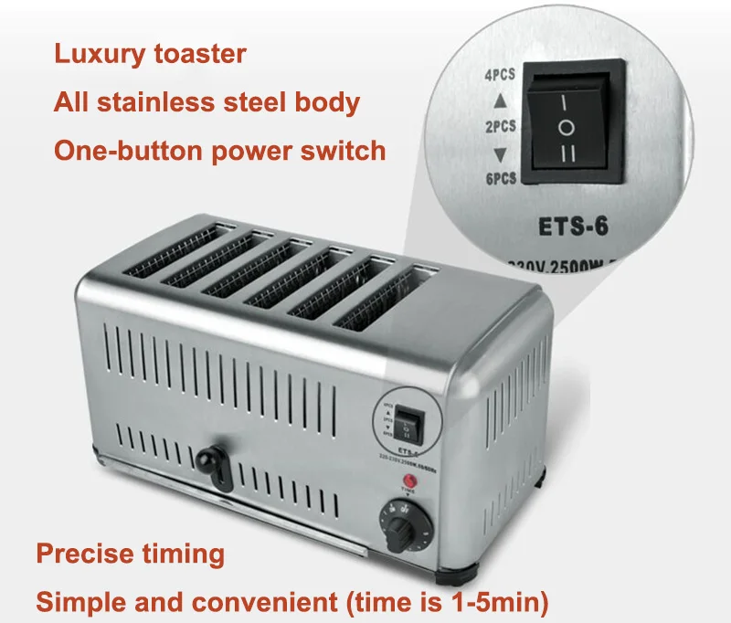 Функция: Выпекание, нагревание. Предназначен для коммерческого использования. Функция зубчатой передачи: 5 передач. Механическое управление таймером. С ручкой и двойным контролем, панель делает эту 6 ломтика в сочетании в одно и то же время. Пищевая сталь, не легко деформируется и ржавеет в различных жестких условиях Одна кнопка выключателя питания, время является точным, простым и удобным (время 1-5 минут). Продукт имеет две модели