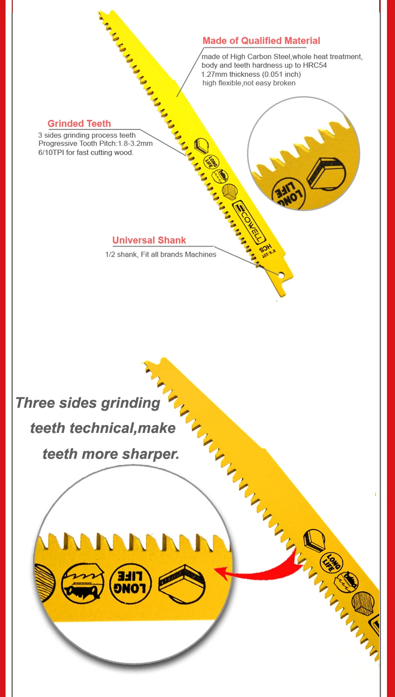 5TPI: подходит для резки дерева, зеленого дерева 6TPI: подходит для резки дерева, гипсокартона, пластика 10TPI: подходит для резки дерева, ногтей, гипсокартона, пластика, тонкого металлического листа, мягкого металла 14TPI: подходит для резки ногтей, тонкого металла, среднего твердого металла, труб 18TPI: подходит для резки среднего металла, твердого металла. 6/12TPIПеременные зубы: подходит для резки дерева с гвоздями, тонкого металла 10/14TPI переменные зубы: подходит для резки дерева, ногтей, гипсокартона, тонкого металла, среднего твердого металла, трубыВы можете выбрать правильные лезвия, как указано выше.