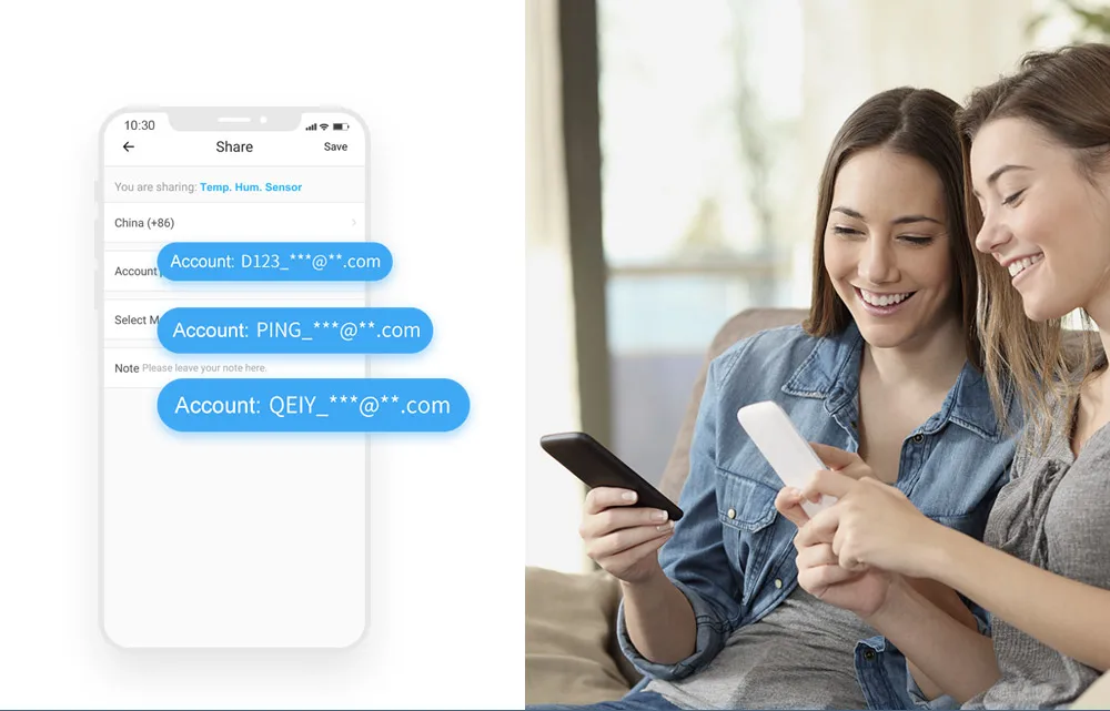 Просто поделитесь сенсором с вашей семьей, и они могут напрямую проверять температуру и влажность на своих мобильных телефонах, не сопрягая их.