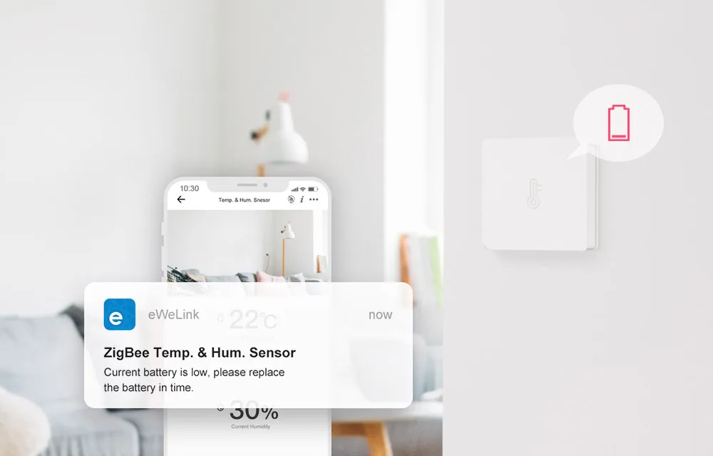 SONOFF SNZB-02-это датчик температуры и влажности ZigBee, который может легко работать с мостом SONOFF ZigBee для отслеживания и записи изменения температуры и влажности в вашем доме, что позволяет проверять все показания в реальном времени в приложении eWeLink. Еще лучше, вы можете установить состояние в смарт-сцене, что Вентилятор включается/выключается, когда температура достигает предельного значения, или осушитель воздуха в вашей комнате начинает работать, когда влажность выше, помогая предотвратить рост плесени и аллергенов. Вы можете установить умную сцену для запуска оповещений через такие события, как высокая/низкая температура, высокая/низкая влажность и многое другое.