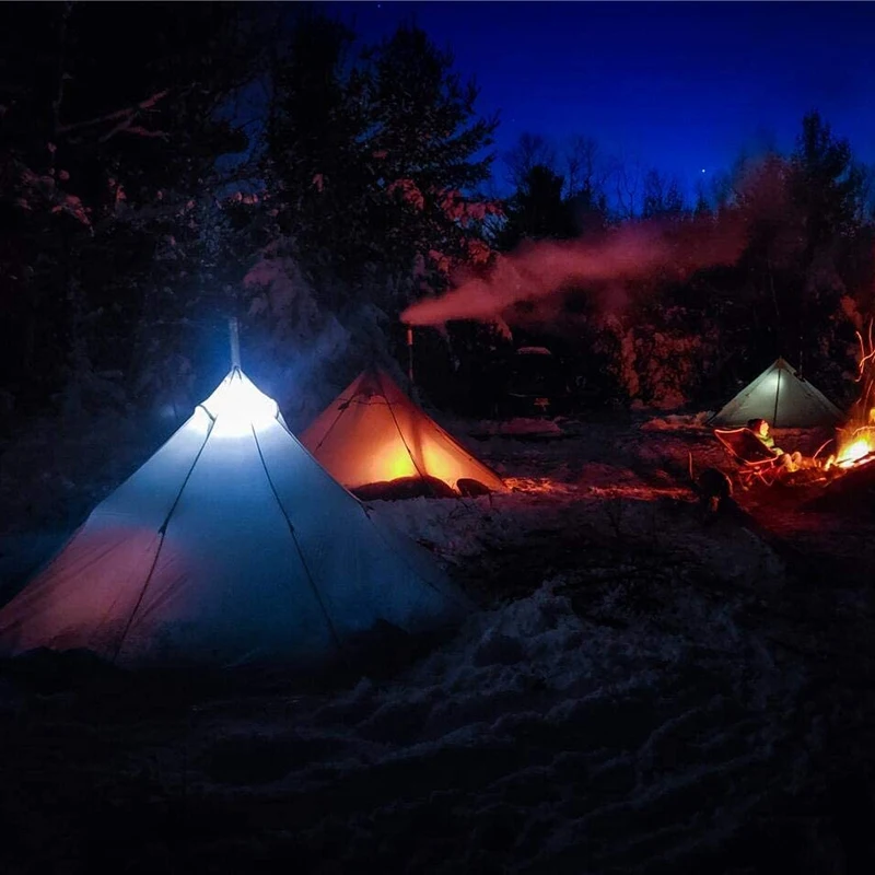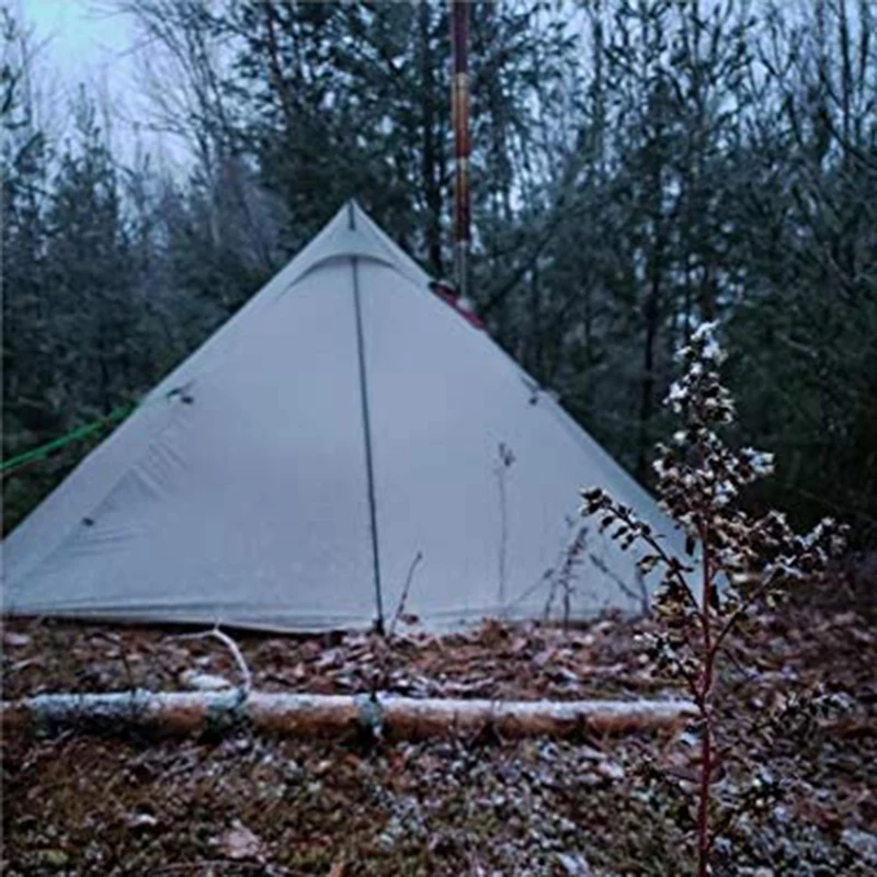 Двойной шатер для упаковки: 10.4 фута/3,2 м в диаметре, 5.2 фута/1,6 м в высоту, достаточно места для 2 человек с верхним отверстием для горящей печи и горячего дымового трубопровода («дымоход»)