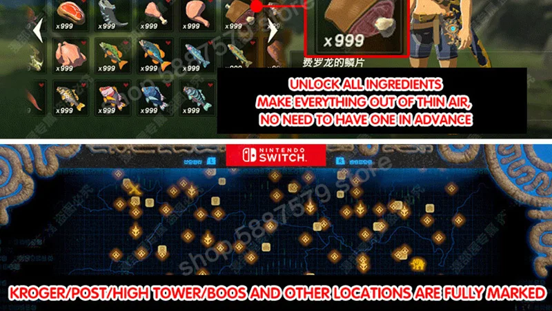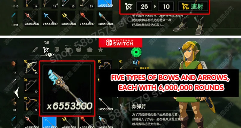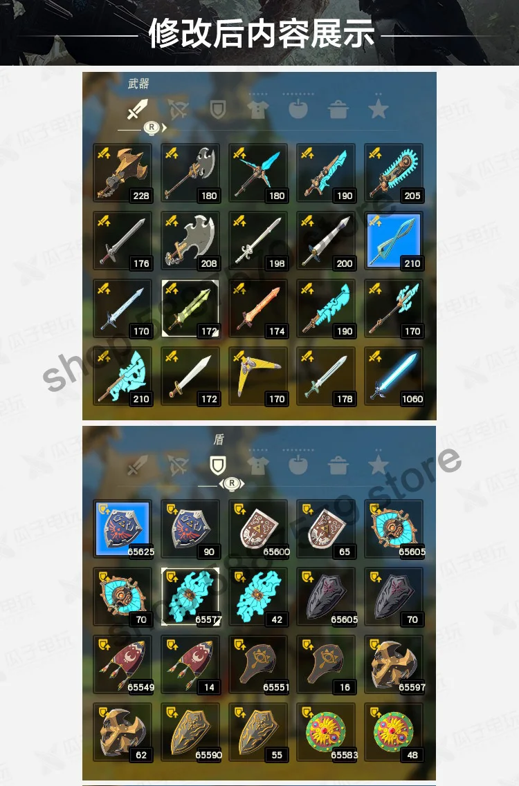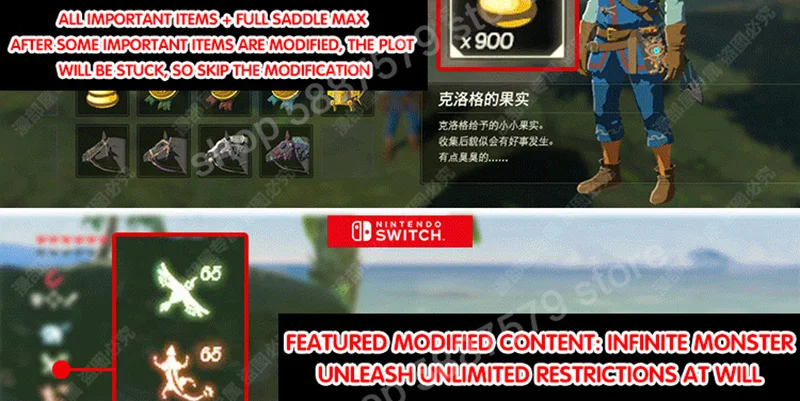 (Все изменены по умолчанию, вы можете связаться со службой поддержки клиентов, если вы не измените его) Примечание: добавлен в текущий ход работы игрока. Не влияет на ход игрового сюжета 1. Rs (rupee) 999999 лунного камня 999999 2. Объем крови 30 сердец (макс), выносливость три круга (макс) 3. Все материалы по 999 4. Все ингредиенты по 999 5. Разблокировка DLC мотоцикла (вам нужно приобрести DLC для изменения, найти его в ярлыке после модификации) 6. Полное седло, Полный Жгут 7. Старшая лошадь 8. Рюкзаки полностью открыты (все расширены до верхнего предела 20 сеток) 9. Важные реквизиты (включая Kroger's fruit MAX, улучшенная версия четырех магических навыков каменной охраны) 10. Знак храма полностью открыт (в том числе важные места для станции post tower boss и т. Д.) 11. Большой Монстр босс позиция знак 12. Мастер меч + мастер меч просветление + спецэффекты на 13. Полная одежда (включая все брони Amiibo, броню и броню со спецэффектами, все четыре звезды полного уровня) 14. Выбор популярных видов оружия с неограниченной долговечностью (включая все виды оружия Amiibo, обычную силу атаки по умолчанию, опциональную атаку BT) 15. Выбор из 14 популярных бантов и стрел с неограниченной долговечностью (включая все виды оружия Amiibo, спецэффекты быстрого огня) 16. Выбор 20 популярных щитов с неограниченной долговечностью (включая все виды оружия Amiibo, обычную защиту по умолчанию и опциональную защиту BT) 17. Шесть видов бантов и стрел по 600 Вт