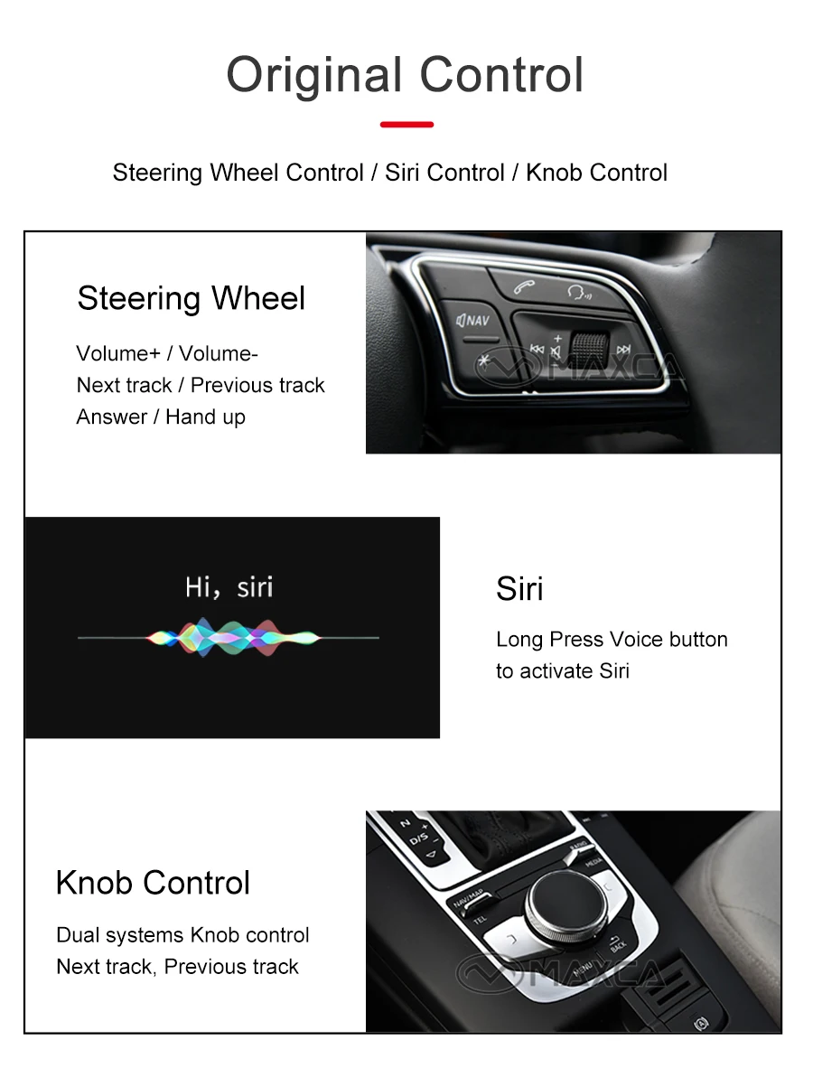 1. Работает с беспроводным Apple CarPlay, сопряжение через Bluetooth, передача через WIFI. 2. Новая функция Airplay, соединенная с usb-кабелем, воспроизведение фильмов/навигации/музыки с iPhone 3. Для работы с проводом CarPlay также, сначала выключите wifi и подключите с помощью кабеля освещения (проводное Удерживайте телефон одновременно) 4. Android Auto, Android Mirroring-Link для телефонов Android 5. GPS навигационные приложения, Google Maps, Waze и Apple Maps доступны, информация о живом движении 6. Музыкальные яблоки Spotify,Apple Music, Amazon и т. д. Аудио через фабричные PCM медиа, текст отображается на дисплее для некоторых приложений. 7. Голосовое управление, говоря "Эй Siri..." 8. Aftermarket фронтальный/задний/360 вход камеры. (Поддерживаются линии динамического наведения) 9. USB флэш-накопитель для воспроизведения музыки и видео путем подключения USB порта от CarPlay kit 10. Регулировка эквалайзера. Лучшее качество звука. Свободно Выбирайте свой любимый стиль (поп, рок, мягкий, стандартный ..) 11. Полное управление кнопками OEM.