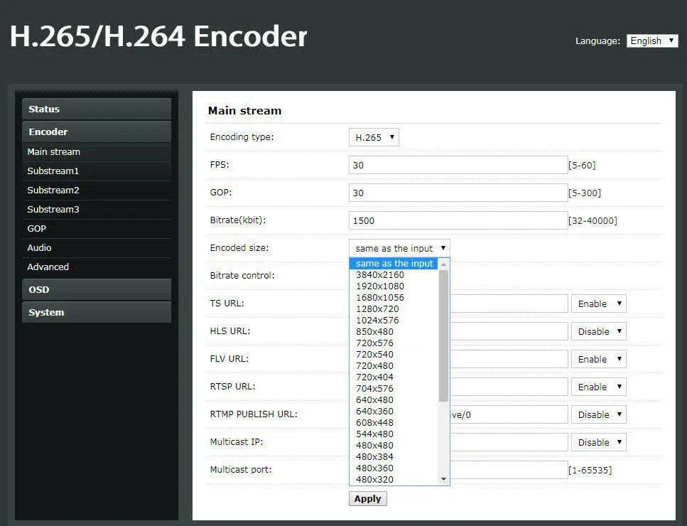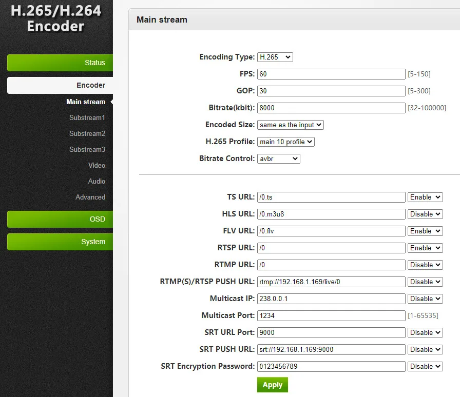 1. Встроенная система Linux, стабильная и эффективная. 2. Дружественный пользовательский интерфейс веб-управления, по умолчанию IP 192.168.1.168, имя пользователя и пароль все admin. 3. Поддержка протоколов RTMP, RTSP, UDP, HTTP, HLS, FLV и ONVIF. 4. Поддержка вывода 1 основного потока и 3 промежуточного потока к различным медиа-серверам одновременно. 5. Основной поток поддерживает выходное разрешение-3840x2160 @ 60fps, 1920x1080, 1680x1056, 1280x720, 1024x576, 850x480, 720x576, 720x540, 720x480, 720x404, 704x576, 640x480, 640x360, 608x448, 544x480, 480x480, 480x384, 480x360, 480x320, 480x272, 480x270, 400x320, 400x224, 352x480, 352x228, 320x256, 320x240, 320x180, 240x180, 176x144. 6. Поддержка текста и BMP фото вставка в качестве логотипа потока для основного потока и 2-го потока. 7. Поддерживает два варианта, один-HDMI в видео + HDMI в аудио, другой-HDMI в видео + аудио. 8. Выходной поток битрейт регулируется. 9. Поддержка обновления прошивки. 10. Ip-адрес можно задать самостоятельно. 11. Поддержка дистанционного управления через порт маршрутизатора вперед. 12. Поддержка записи потока TS на usb-диске и tf-карте