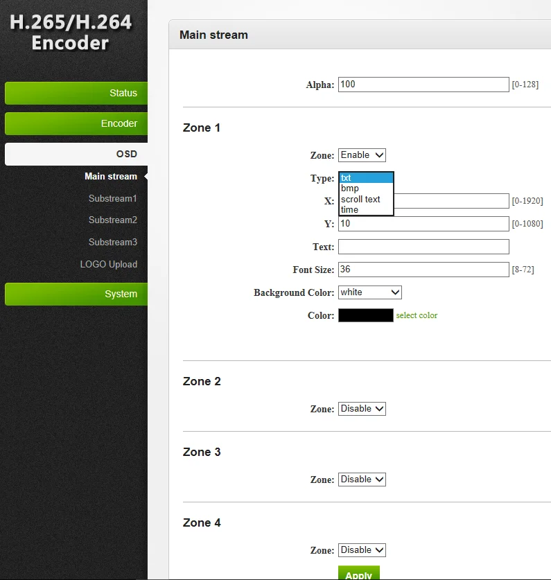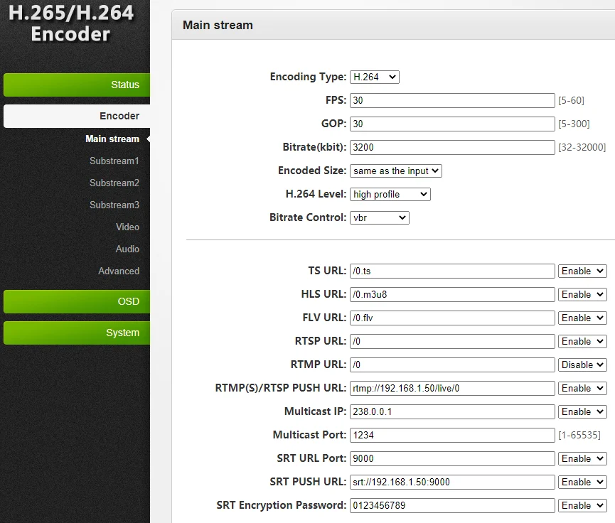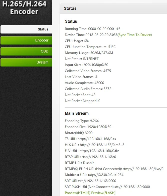 1. Встроенная система Linux, стабильная и эффективная. 2. Дружественный пользовательский интерфейс веб-управления, IP по умолчанию 192.168.1.168. Имя пользователя-admin, пароль-admin. 3. Поддержка протоколов RTMP/RTMPS, RTSP, UDP, HTTP, HLS, FLV и ONVIF. 4. Поддержка вывода 1 основного потока и 3 промежуточного потока к различным медиа-серверам одновременно. 5. Основной поток поддерживает выходное разрешение-1920x1080, 1680x1056, 1280x720, 1024x576, 850x480, 720x576, 720x540, 720x480, 720x404, 704x576, 640x480, 640x360, 608x448, 544x480, 480x480, 480x384, 480x360, 480x320, 480x272, 480x270, 400x320, 400x224, 352x480, 352x228, 320x256, 320x240, 320x180, 240x180, 176x144. 6. Поддержка текста и BMP фото вставка в качестве логотипа потока для основного потока и 2-го потока. 7. Поддерживает два варианта, один-HDMI в видео + HDMI в аудио, другой-HDMI в видео + аудио. 8. Выходной поток битрейт регулируется. 9. Поддержка обновления прошивки. 10. Ip-адрес можно задать самостоятельно. 11. Поддержка дистанционного управления через порт маршрутизатора вперед. 12. С HDMI Loopout