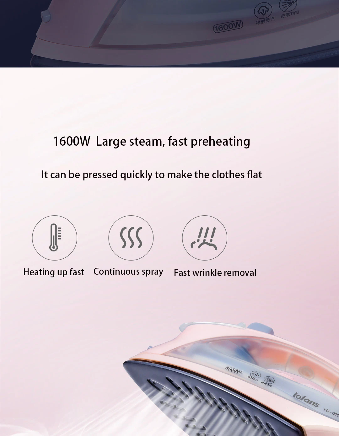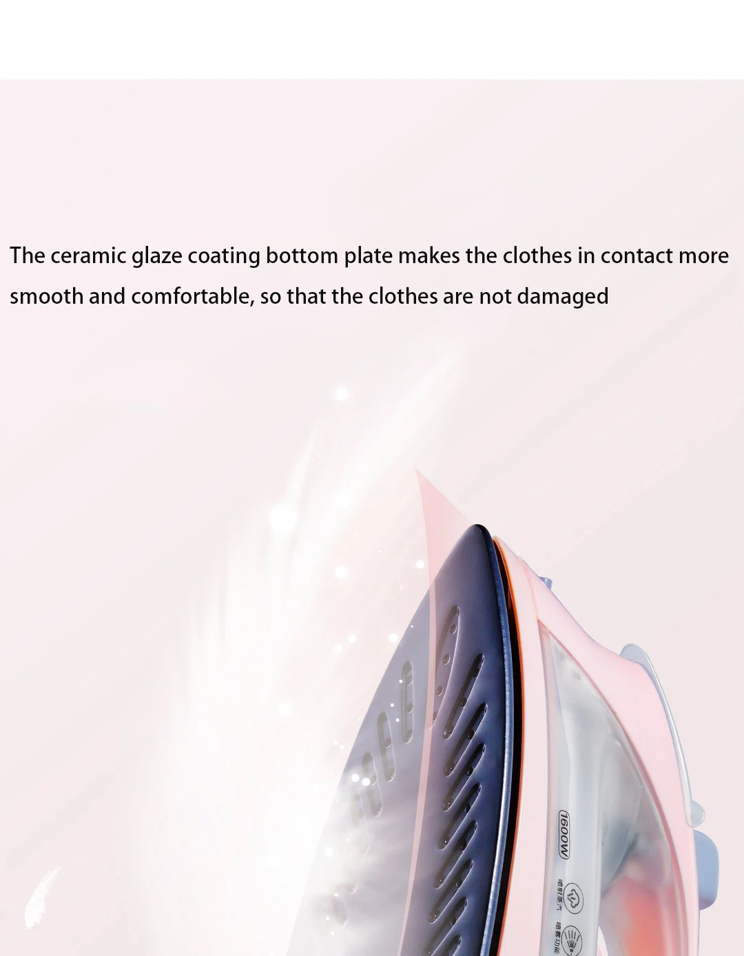 ● Большой пар 1600 Вт: сильный пар мгновенно вспыхивает непосредственно на глубину волокна, разглаживает морщины.