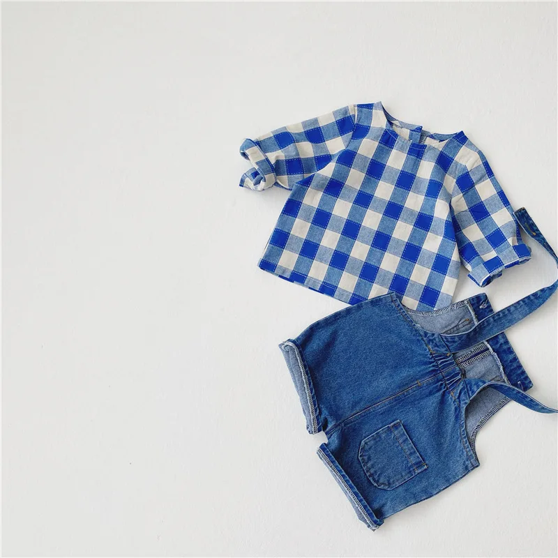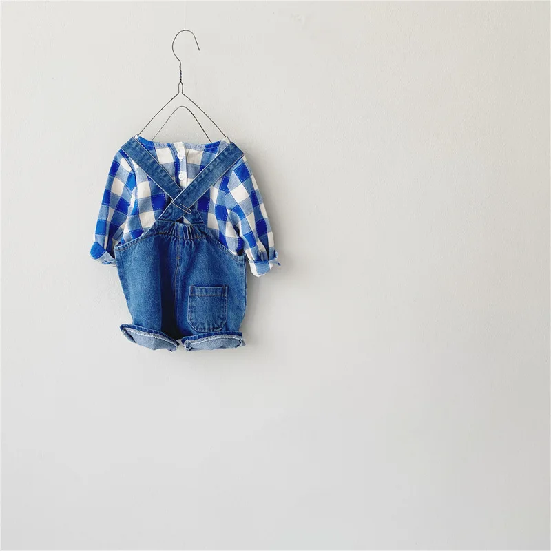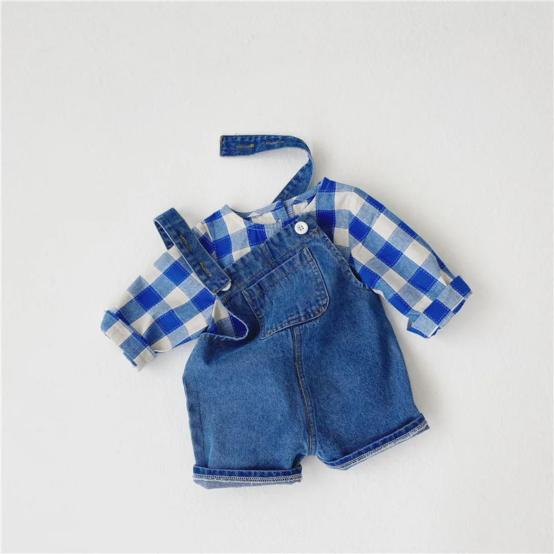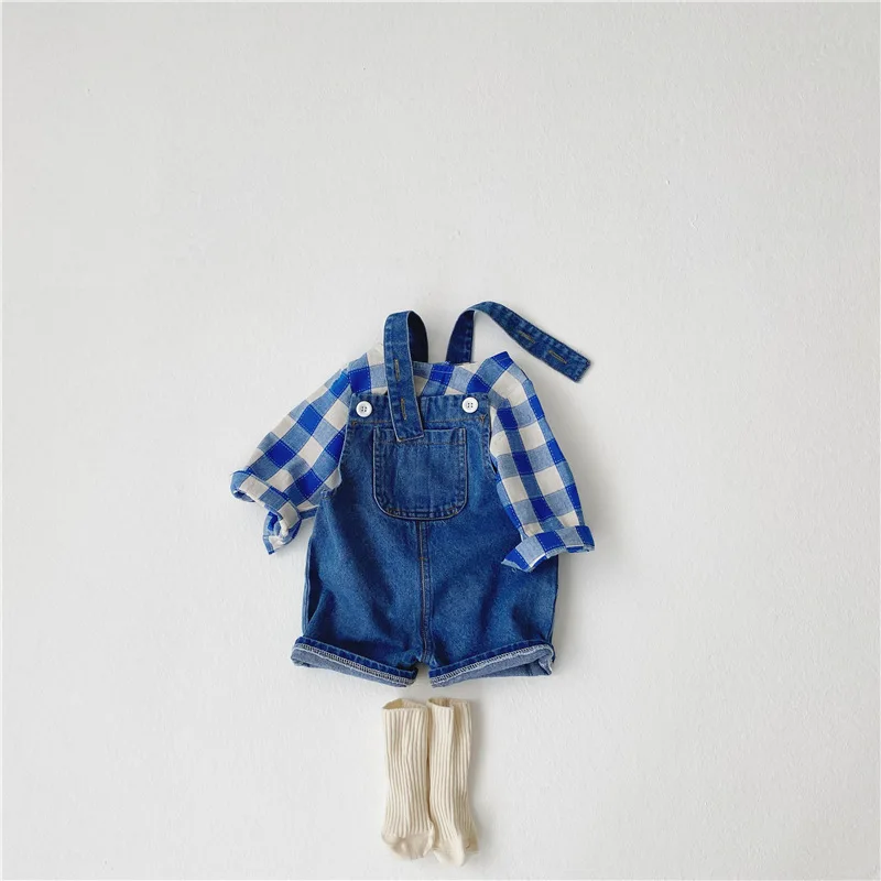 Комплект одежды для новорожденных мальчиков, Осень-зима комплект детской одежды, комплект рубашка в клетку + джинсовый комбинезон, 2 предмета, комбинезон для маленьких мальчиков От 0 до 2 лет