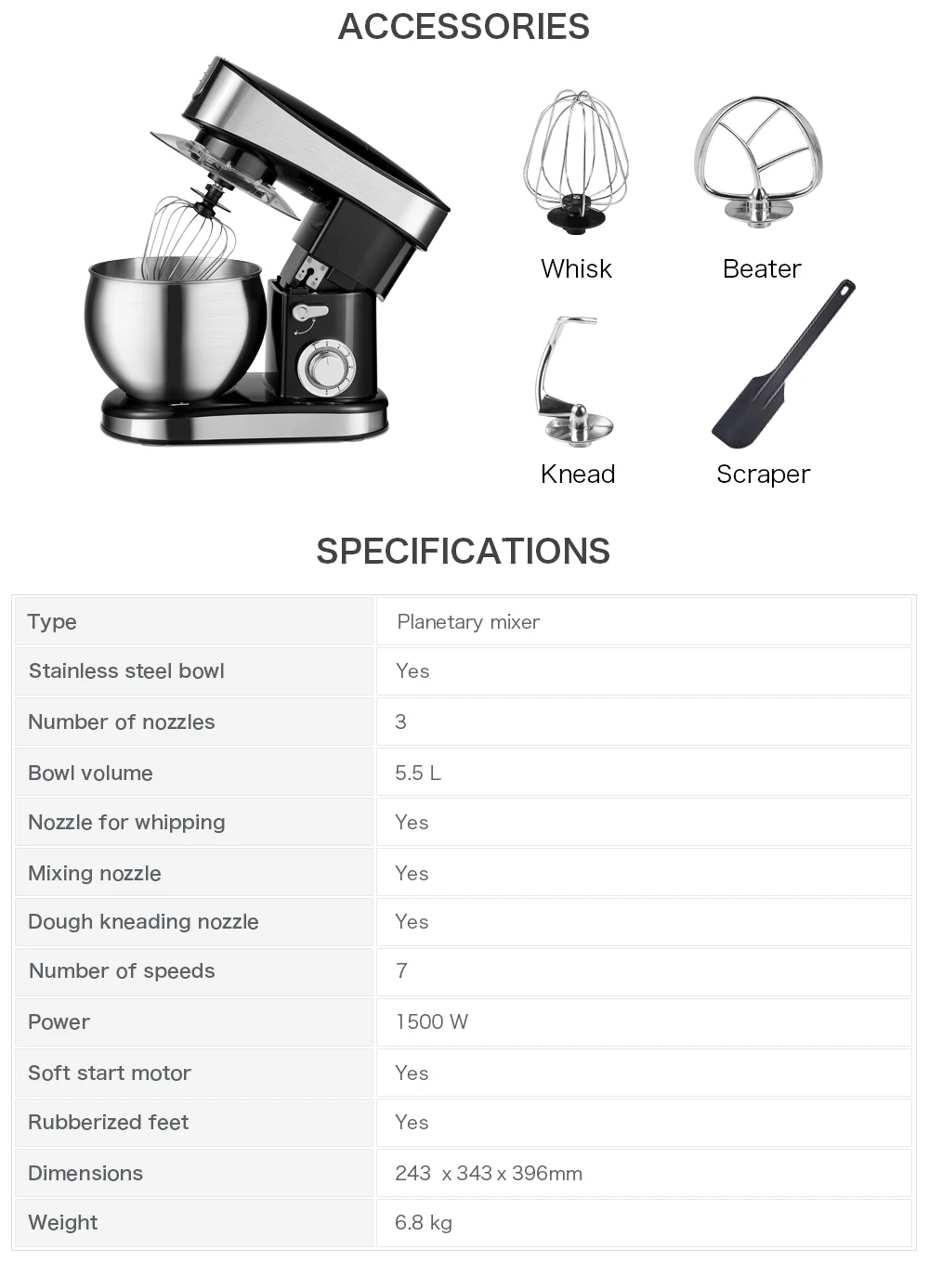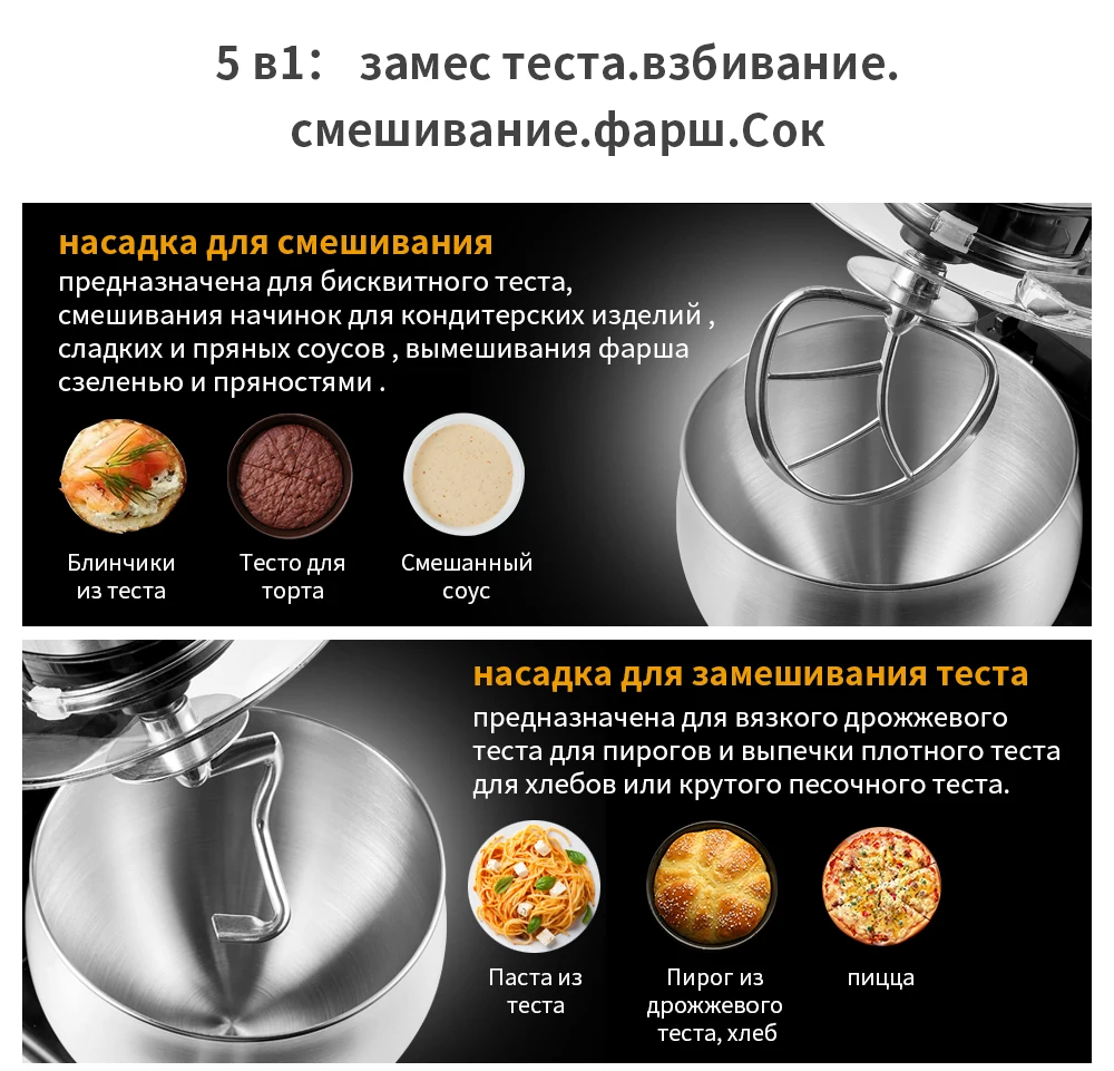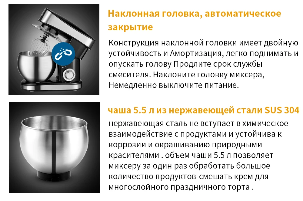 1. Еда класс 304 нержавеющая сталь, безопасный и прочный без ржавчины Высоко-стандарт нержавеющая сталь миска для смешивания безопасен для здоровья и безопасные для выпечки. 2. 5.5L емкость для того, чтобы удовлетворить все ваши требования питание желудка свободно управлять Размер порции, избежать ненужной траты ингредиенты, И перемешать с большим комфортом. 3,1500 Вт медный мотор перемешивания без давления, высокой мощности и высокой скорости, быстро рассеивания тепла и долгое время использования: "Бьющий" миксер для теста не замерзнуть. 4. 7-ступенчатая Бесплатная регулирование скорости, к каждому его питание с сердцем 5. Вращающийся дизайн простых в использовании, повороты аккуратно, удобный 6. Прозрачный Анти-всплеск крышки питания, let it, защищая его состав 7. Гуманизированный дизайн, легко добавлять материалы в любое время, чтобы предотвратить материал от брызг во время активности.