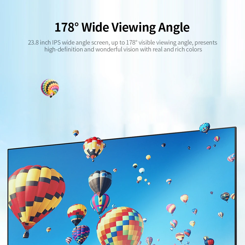 23,8 дюймовый IPS широкоугольный экран, до 178 ° Видимый угол обзора, обеспечивает высокое разрешение и прекрасное видение с реальными и богатыми цветами.