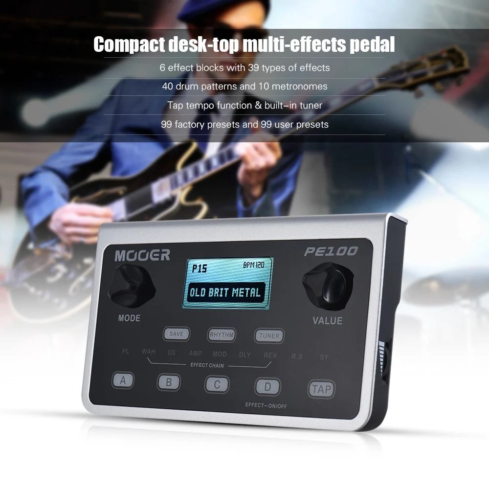 Описание стиля 6:PE100-это Карманный, настольный блок, который содержит все, что нужно гитаристу, плотно обернутый в небольшой гладкий корпус. Полный спектр моделей amp, множество эффектов и стопбоксов, точный тюнер, барабанные узоры и метрономы. Это двойной выходной разъем делает его идеальным для подключения к усилителю, hifi, наушникам или непосредственно к миксеру или компьютеру для прямой записи. Очень легко программировать, достаточно маленький, чтобы проскальзывать в карман и питаться от небольшого адаптера питания постоянного тока или от аккумулятора. PE100 идеально подходит для гитариста на ходу.Особенности:Компактная настольная педаль с несколькими эффектами с ЖК-дисплеем высокой яркости и удобным сенсорным нажатием кнопки.6 блоков эффектов, содержащих 39 видов эффектов в цепочке эффектов: 2 Авто wah, 10 овердрайв и искажений, 7 моделей amp, 11 модуляции, 5 задержек, 4 реверберации.40 шаблонов барабана и 10 метрономов; Функция tap tempo для использования с барабанной машиной, эффектами метронома и задержки; Встроенный тюнер (диапазон настройки 435 Гц-445 Гц).99 заводских пресетов и 99 пользовательских пресетов и 4 кнопки быстрого отзыва (A, B, C, D) обеспечивают простой способ мгновенно хранить и запоминать 4 ваших любимых пресетов.Двойной выбор источника питания: адаптер питания постоянного тока 9 В (входит в комплект) или 2 * батарейки типа "ААА" (не входит в комплект); Оснащен 1/4 "моно входными и выходными разъемами и 1/8" стерео наушниками и AUX в гнездах.Характеристики:Бренд: MOOERМодель: PE100Модули: 6Виды эффекта: 39Заданный патч-память: 99Заданный пользовательский патч-память: 99Вход: 1/4 "моно аудио разъемВыход: 1/4 "моно аудио разъемВыход наушников: 1/8 "стерео аудио разъемAUX IN: 1/8 "стерео разъемИсточник питания: адаптер переменного тока 9 В постоянного тока 300 мА (входит в комплект) или 2 * батарейки типа "ААА" (не входит в комплект)Адаптер питания: 100-240 В штепсельная вилка ВеликобританииТовар Размеры: 13,7*8*2,5 см/5,4*3,1 * 1inТовар Вес: 240g/8,5 ozПосылка Размеры: 15*8,5*8,5 см/5,9*3,3 * 3.3inВес посылка: 385 г/13,6 унцийПримечание:Батарейки в комплект не входят