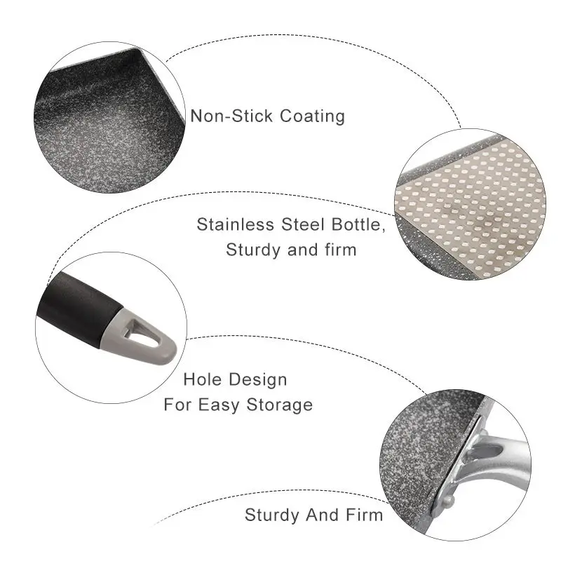 Спецификация Цвет: как показано Тип: антипригарный Материал: алюминиевый сплав Размеры: Пан: 37 см * 13 см * 3,3 см, лопатка: 25,5*12 см Характеристика Здоровое антипригарное покрытие, антипригарное и прочное Нижняя часть горшка изготовлена из магнитно-проводящего дна из нержавеющей стали, а газовая плита универсальна Нескользящая ручка, прочная и красивая Усиленный с длинными винтами, не свободно Меньше жирного дыма, легко чистить