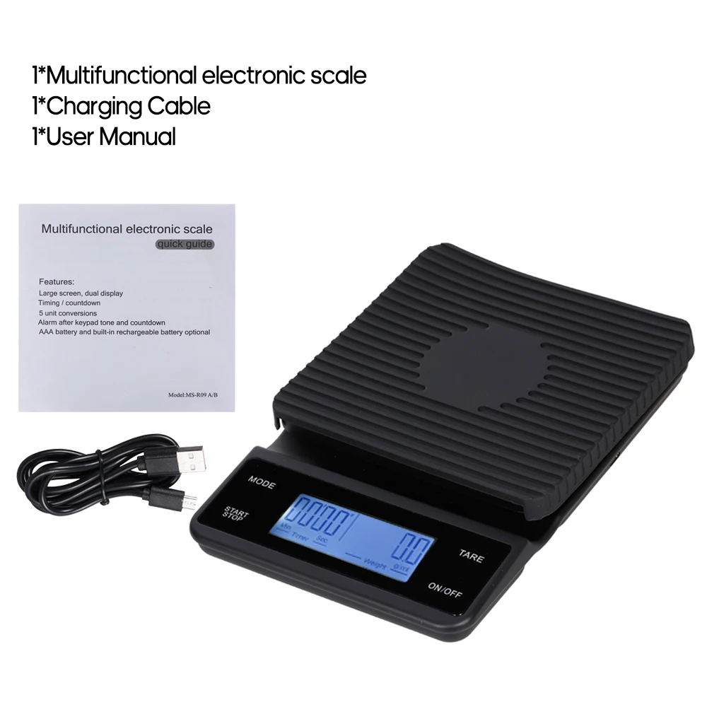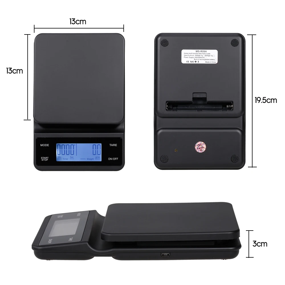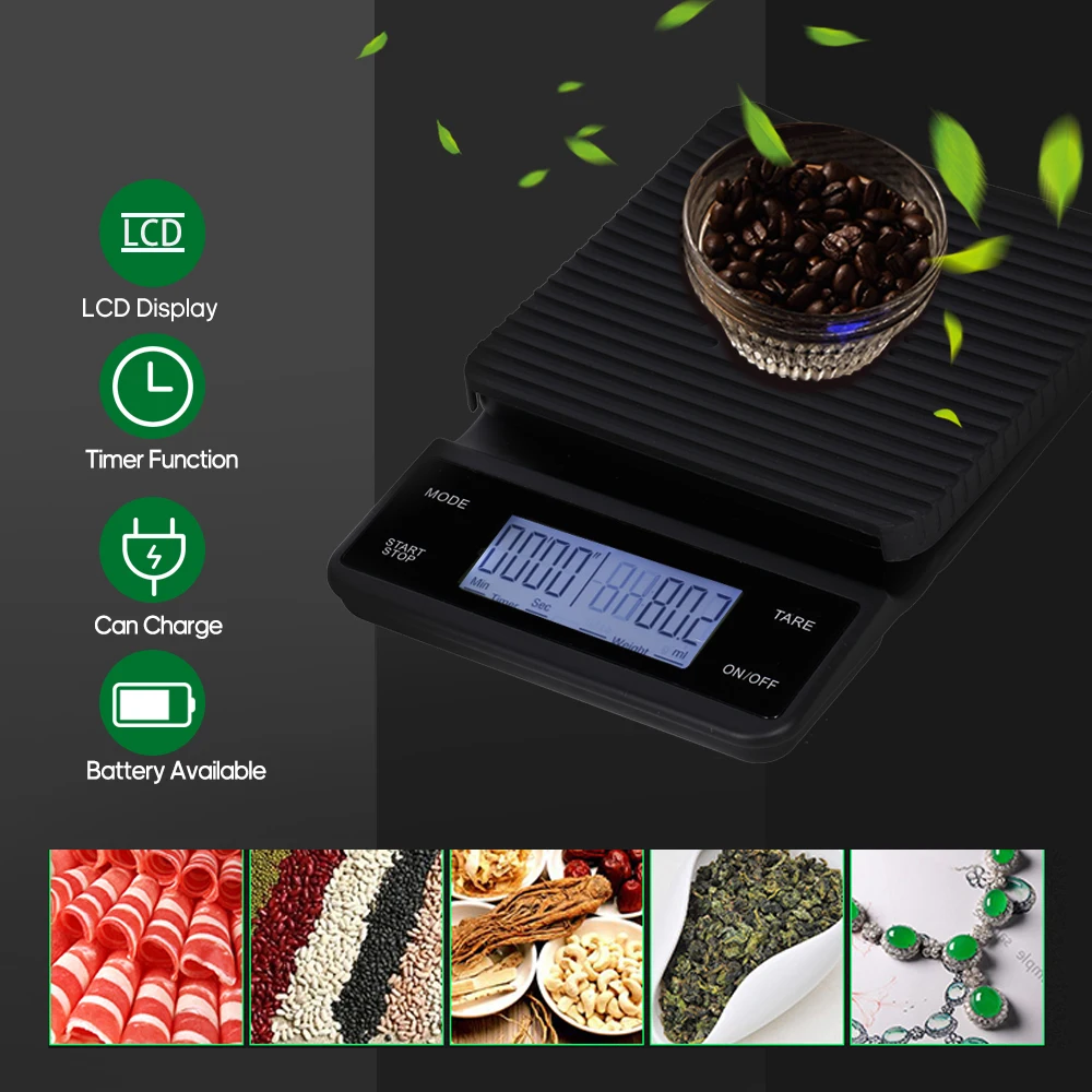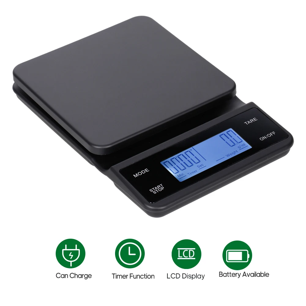 Многофункциональность: электронные весы имеют функцию очистки нулевого ключа и функцию преобразования блока (кнопка режима). Таймер отображает минуты и секунды. Функция тары: заваривать вкусный кофе, измерение количества экстракции и время извлечения незаменимо. Ml, oz, lb, g/ml, g пять единиц могут быть свободно преобразованы для удовлетворения требований взвешивания различных ингредиентов.