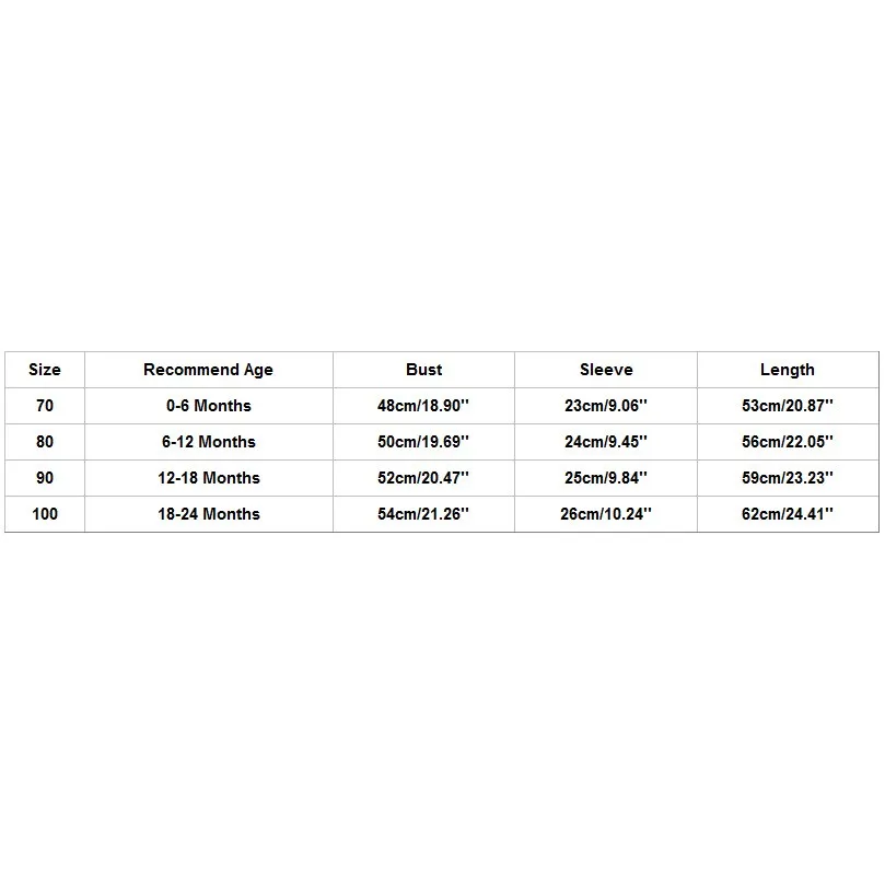 Размеры Рекомендованный возраст; Ширина Обхват груди Рукава Длина 70 Для детей от 0 до 6 месяцев 48 см/18,90'' 23 см/9,06'' 53 см/20,87'' 80 6-12 месяцев 50 см/19,69'' 24 см/9,45'' 56 см/22,05'' 90 12-18 месяцев 52 см/20,47'' 25 см/9,84'' 59 см/23,23'' 100 18-24 месяцев 54 см/21,26'' 26 см/10,24'' 62 см/24,41''