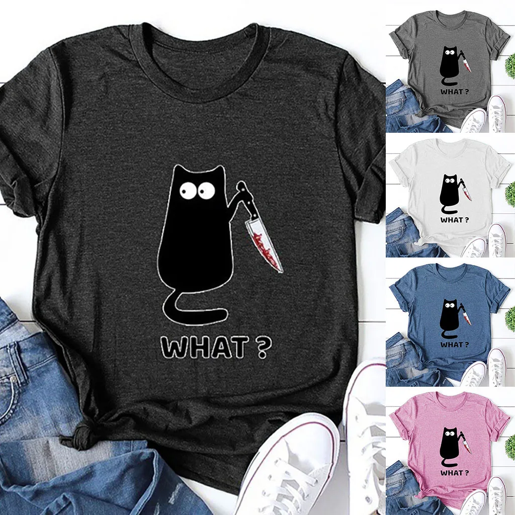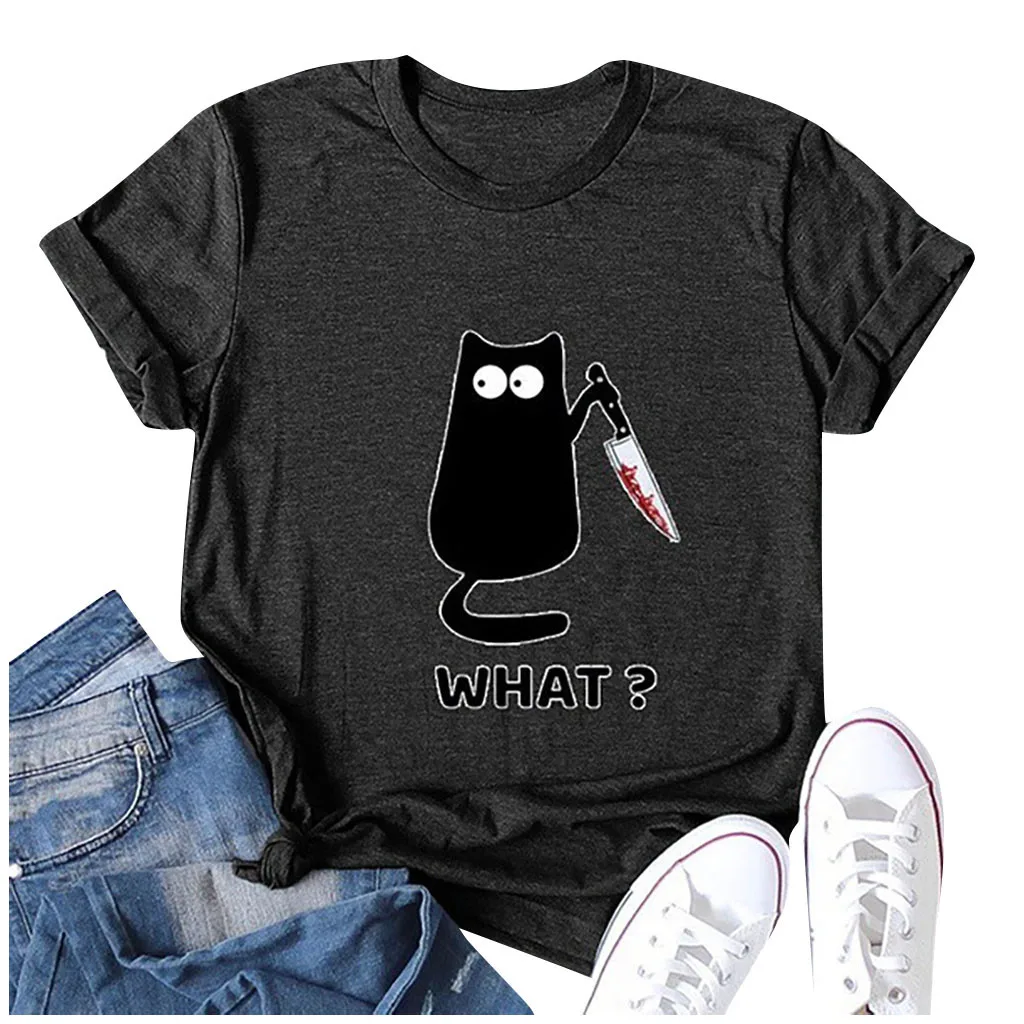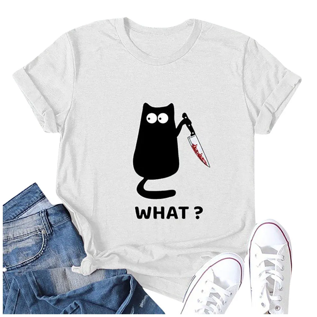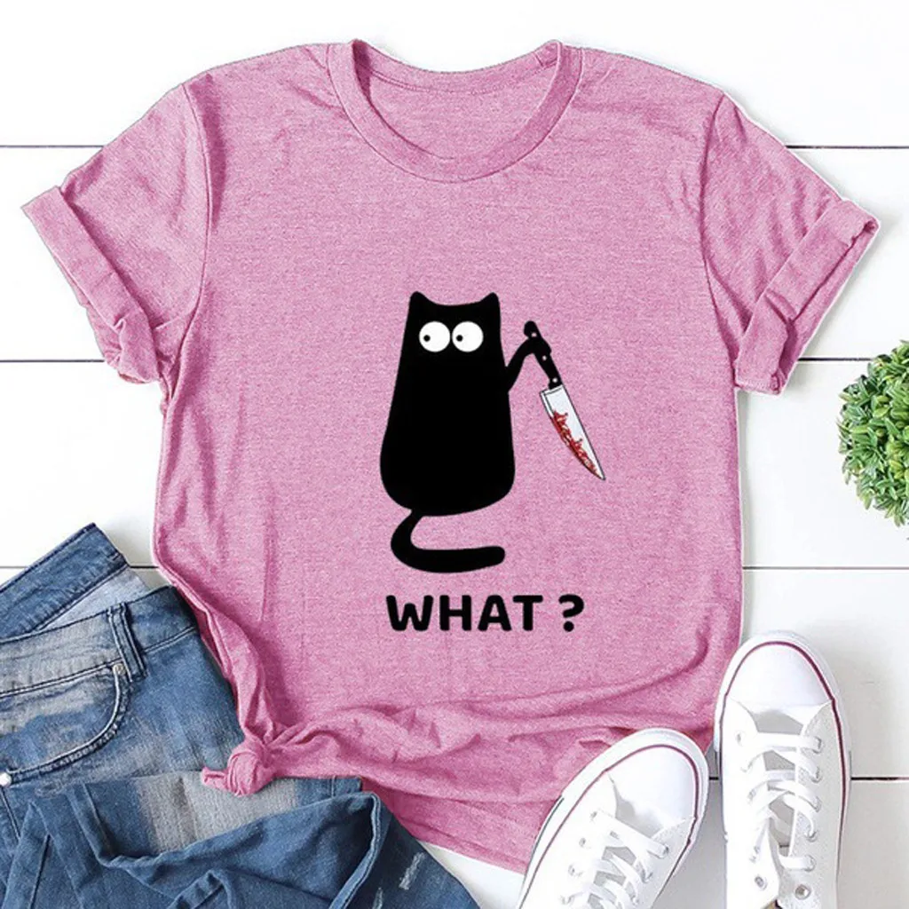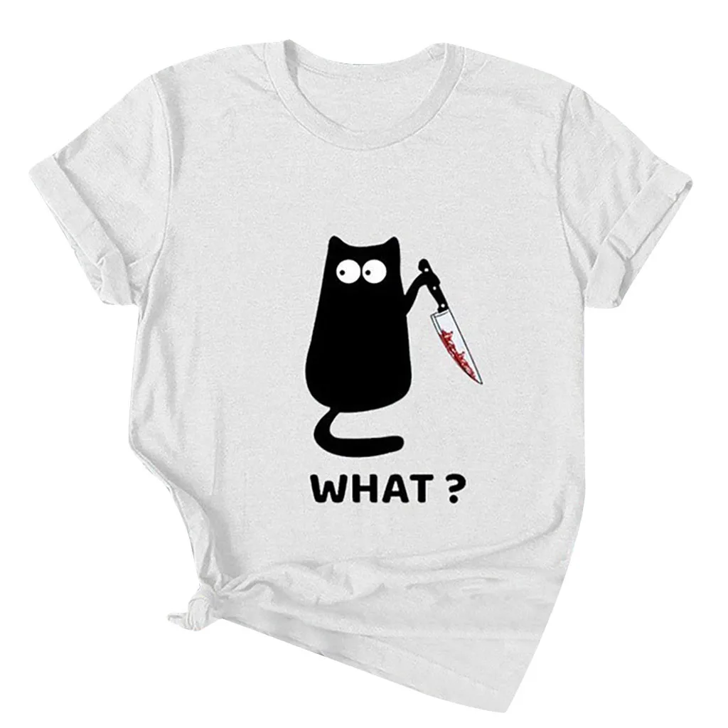 Женская Повседневная Блузка с круглым вырезом и принтом в виде кота