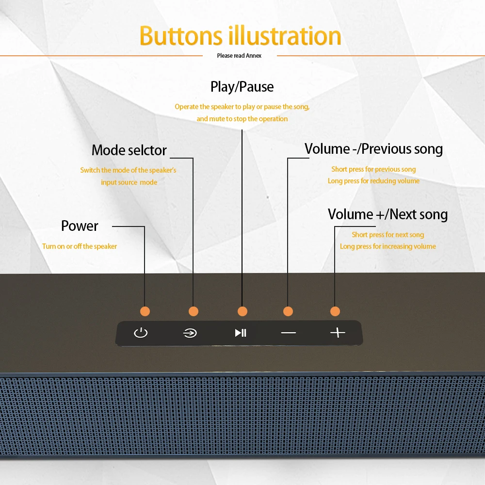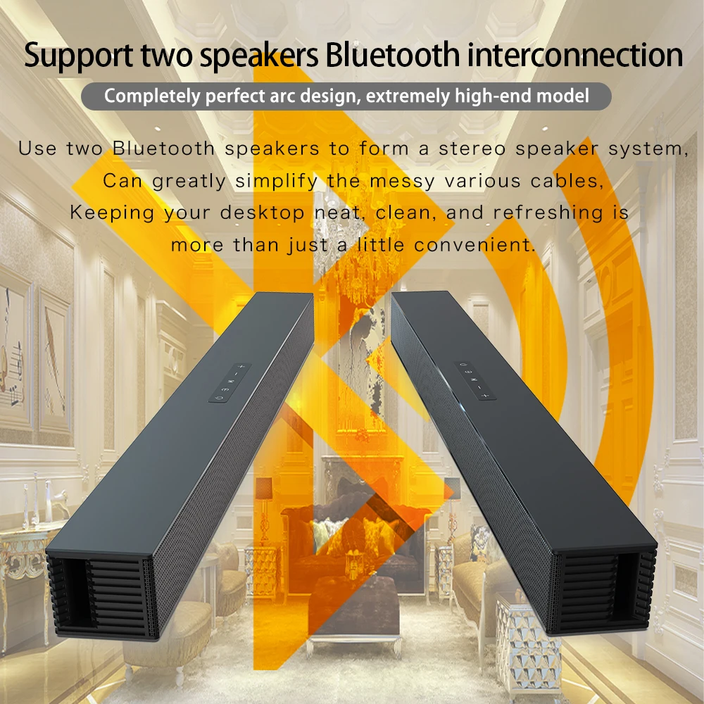 Канал: 2,0 1. Версия Bluetooth: V5.0 2. Динамик: 10 Вт * 4 3. Расстояние Bluetooth: 10 м 4. Батарея Емкость: 4000mA 3,7 V 5. Номинальное напряжение: 5 В постоянного тока 6. Время воспроизведения музыки: около 8 часов. 7. Время работы в режиме ожидания: 240 часов. 8. 1 а Время зарядки: около 4 часов. 9. Аудио вход: Bluetooth,HDMI(ARC), оптический, коаксиальный 3,5 мм Aux, USB 10. Размер: 600 × 60 × 54 мм 11. Вес нетто: 1060 г 12.FM Радио Частота: 87,5-108 13. В комплект входят: HDMI кабель, коаксиальный кабель, волоконно-оптический кабель, 3,5 мм AUX кабель, пульт дистанционного управления, кабель для зарядки, инструкция 14. Поддержка ТВ/ПК/телефона/планшета/ноутбука/MP3/MP4/ DVD плеера/TV Box аудио