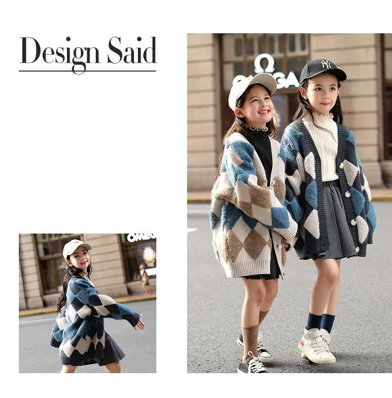 2020 г., осенне-зимняя трикотажная куртка-кардиган для девочек-подростков повседневное длинное пальто-свитер свободного кроя в клетку с буквенным принтом верхняя одежда для детей возрастом от 15 до 16 лет