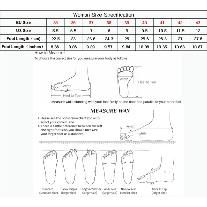 Attention:1. There might be slightly difference in color, because of the computer monitor settings.2. With the difference in the measurement method, please allow 1-3cm in size deviation (1cm=0.39 inch).Thank you for understanding!!3.Our size is not standard EUR size, and it is only equal to foot length!4.The size standard different countries and different manufucturers are different, your foot length is the only criterion for choosing size.